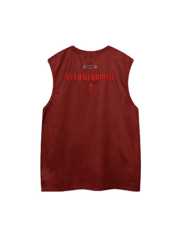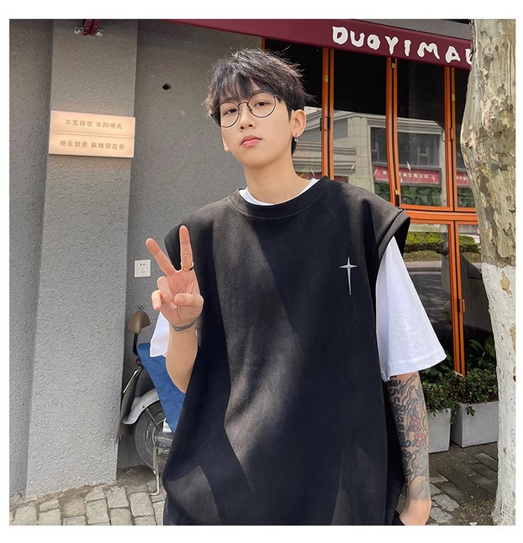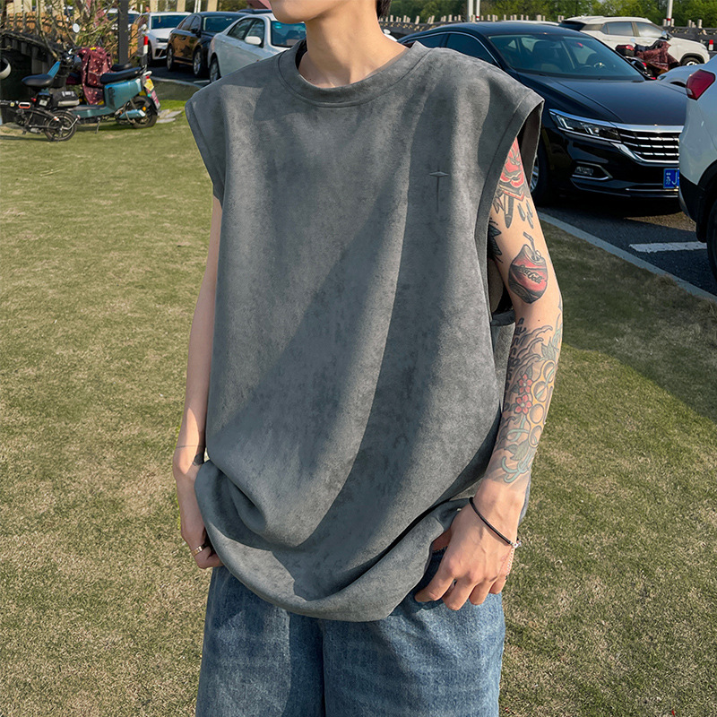 刺绣麂皮绒背心男夏季潮牌痞帅宽松运动坎肩美式高街重磅无袖t恤