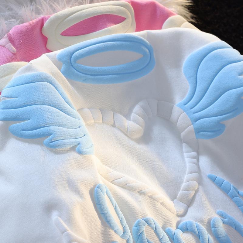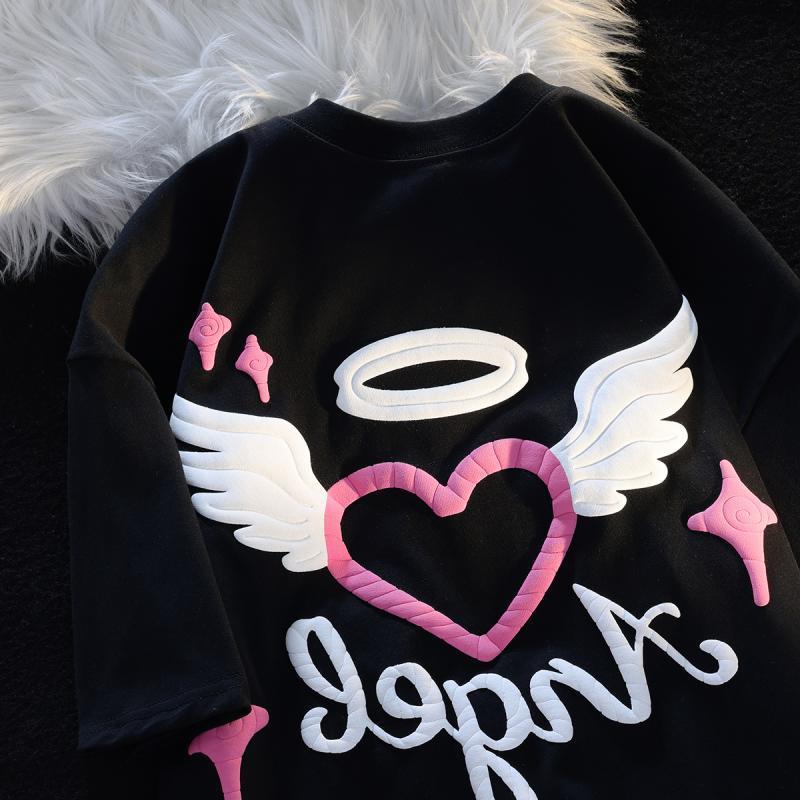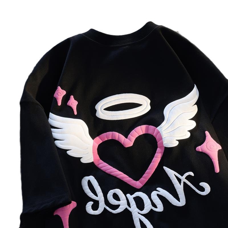 2-300斤胖M日系发泡天使爱心短袖t恤男女夏季情侣ins半袖正肩上衣