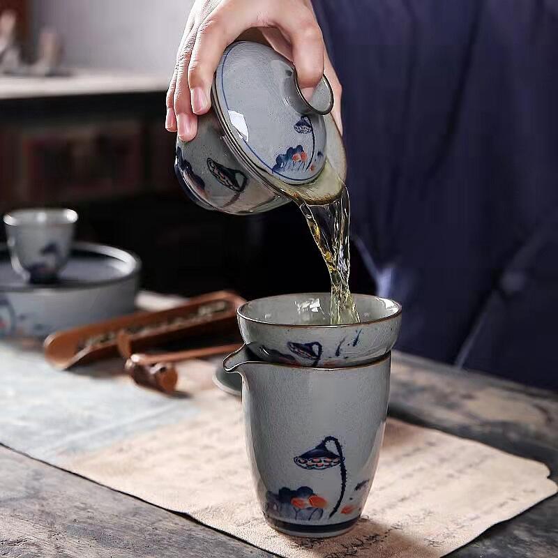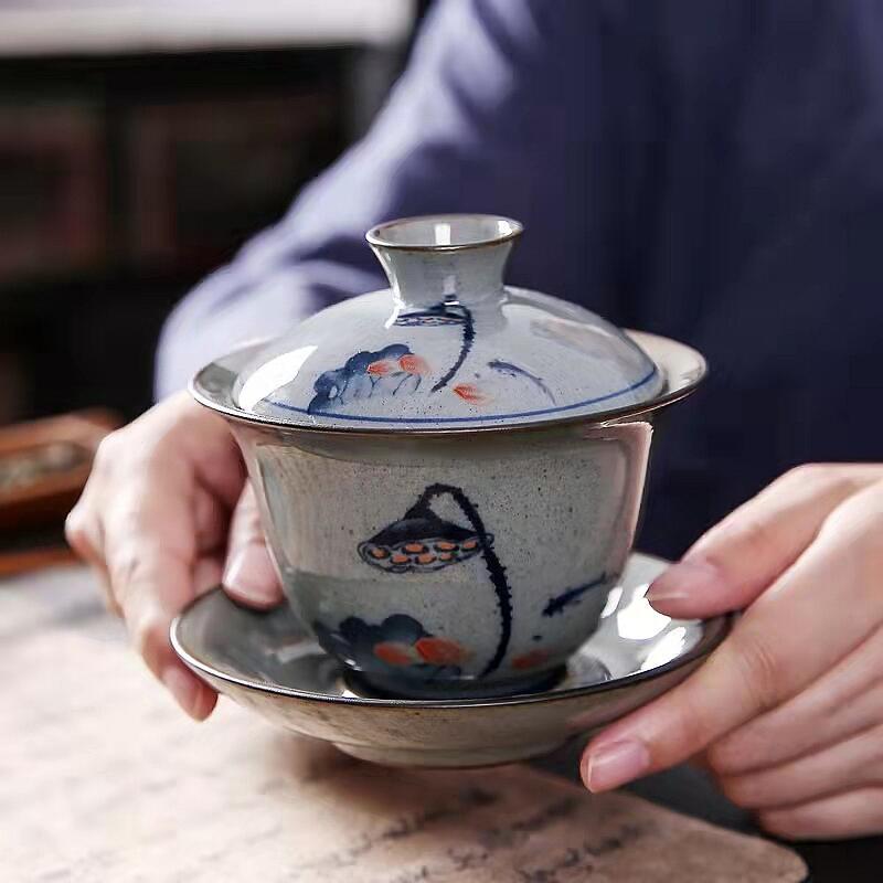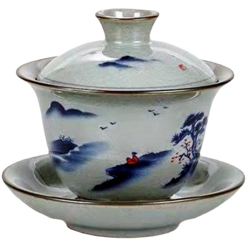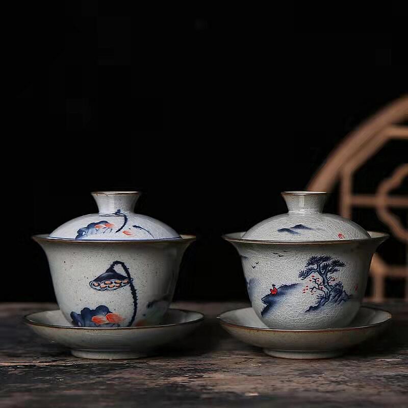 哥窑家用复古盖碗茶杯创意釉上彩青花三才带盖泡茶壶仿宋茶具