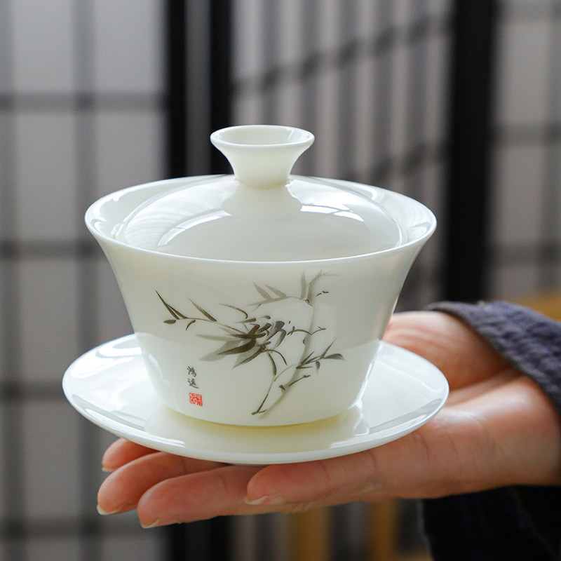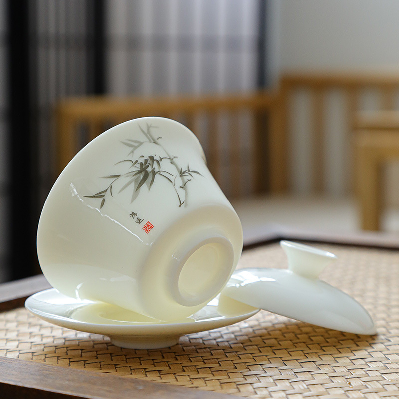 羊脂玉简约三才盖碗泡茶碗功夫茶具套装家用茶碗茶杯茶楼170ml