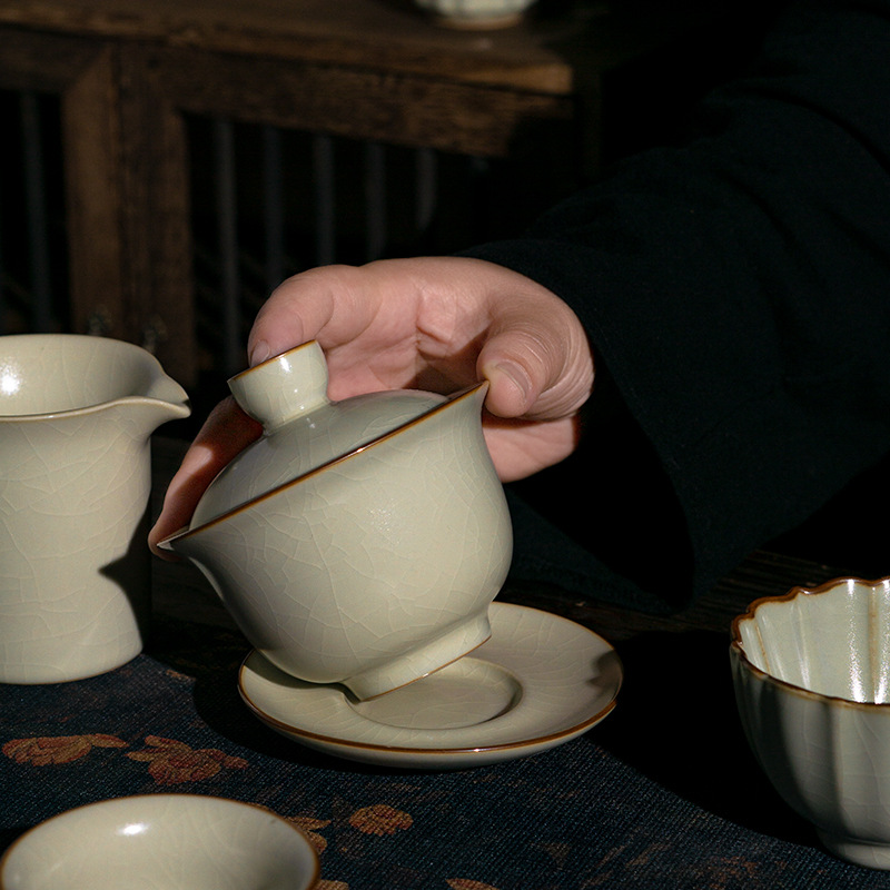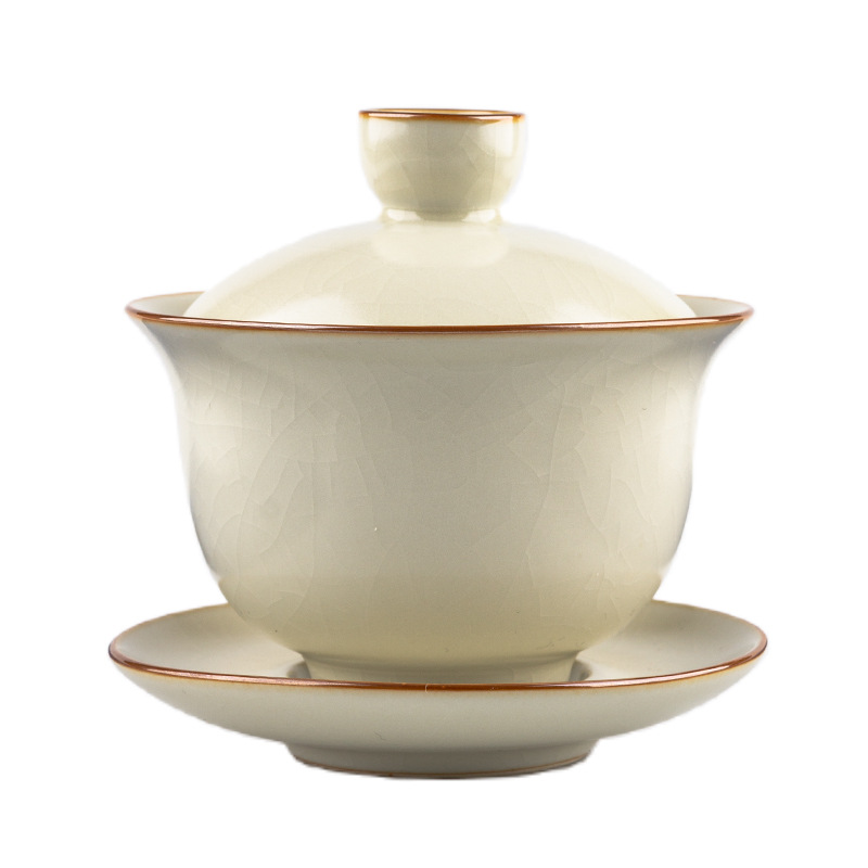 汝窑米黄色圆融盖碗-有养金线(礼盒装)