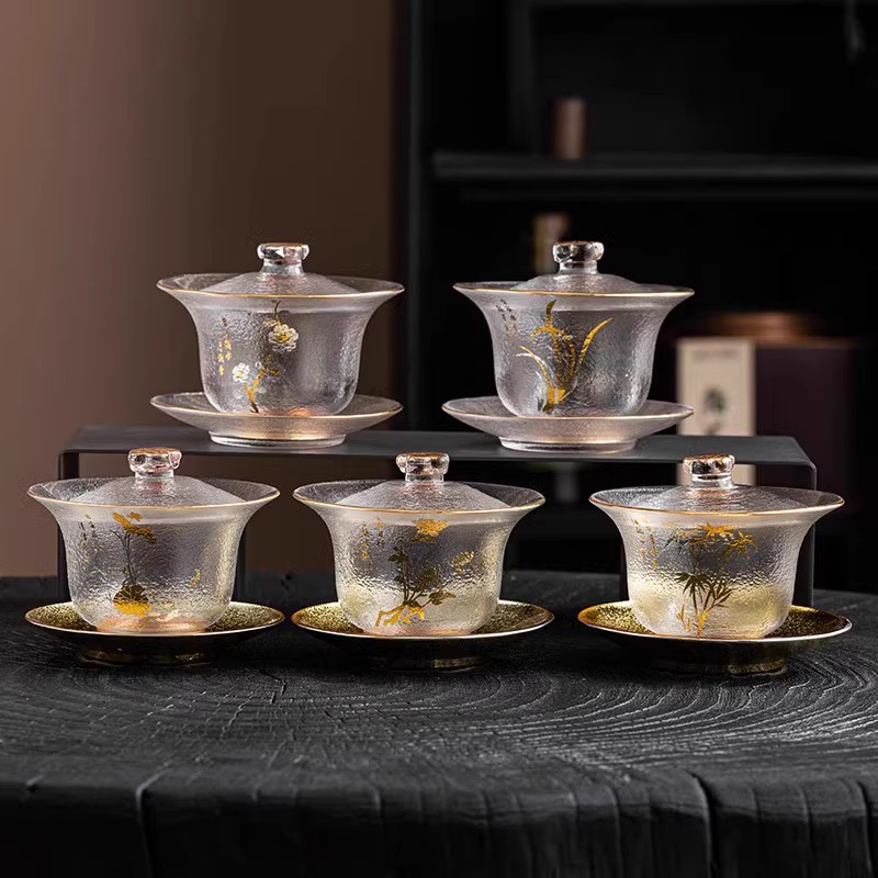 水晶玻璃描金三才盖碗茶碗家用功夫茶具加厚不烫手带盖泡茶器