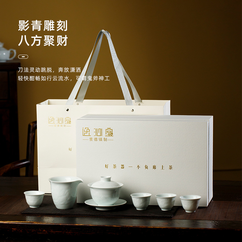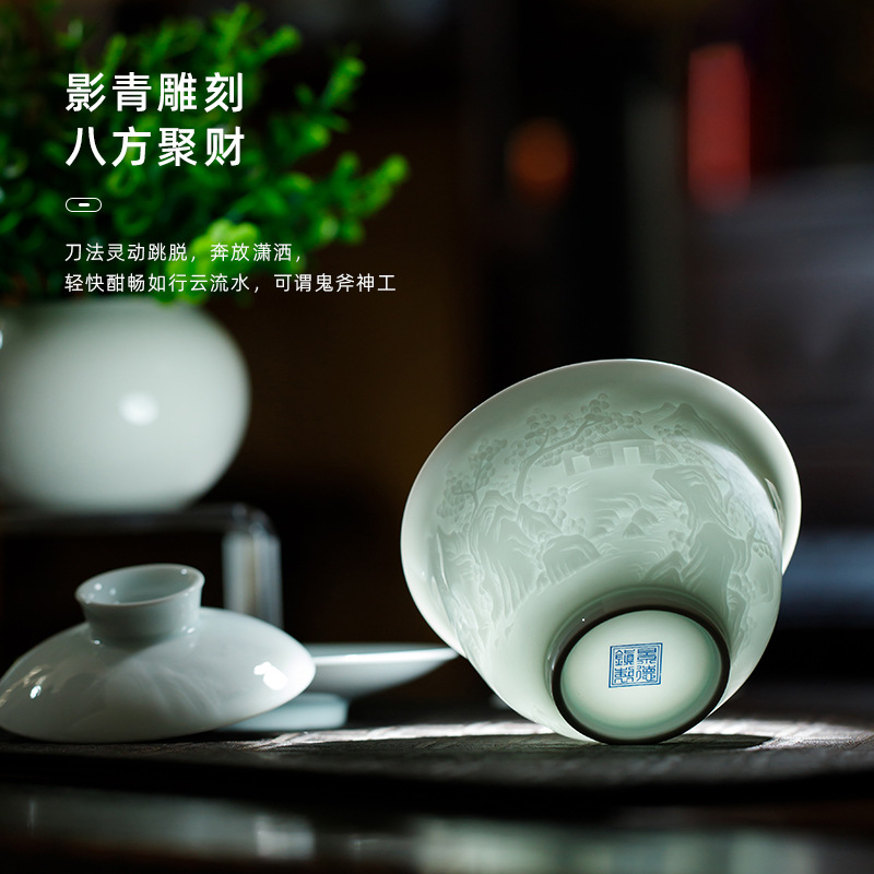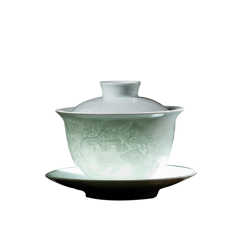 景德镇陶瓷三才盖碗茶碗茶杯泡茶带盖高档不烫手茶具影青白瓷浮雕