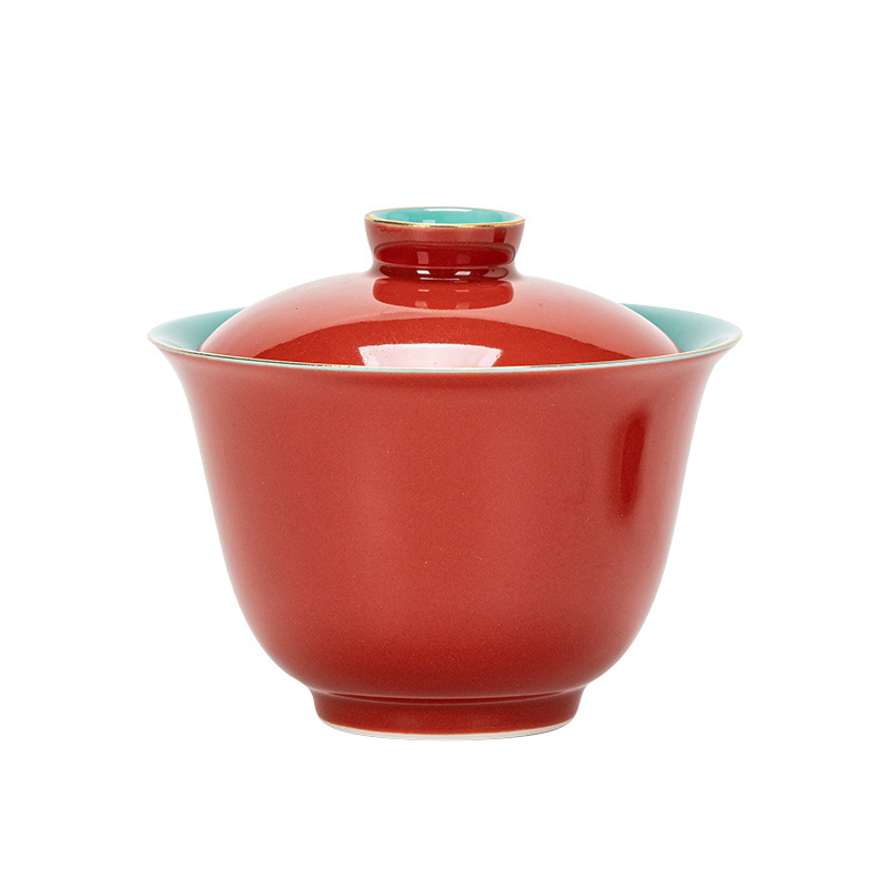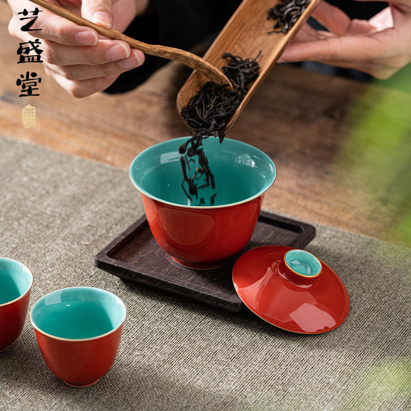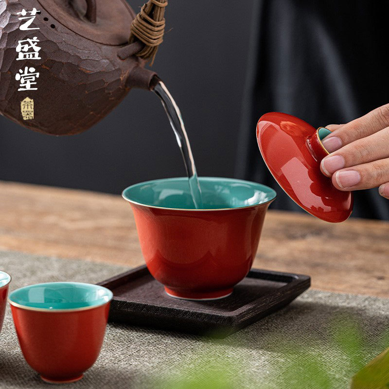简红鎏金盖碗中式家用两才盖碗高端手工品茗杯功夫茶具