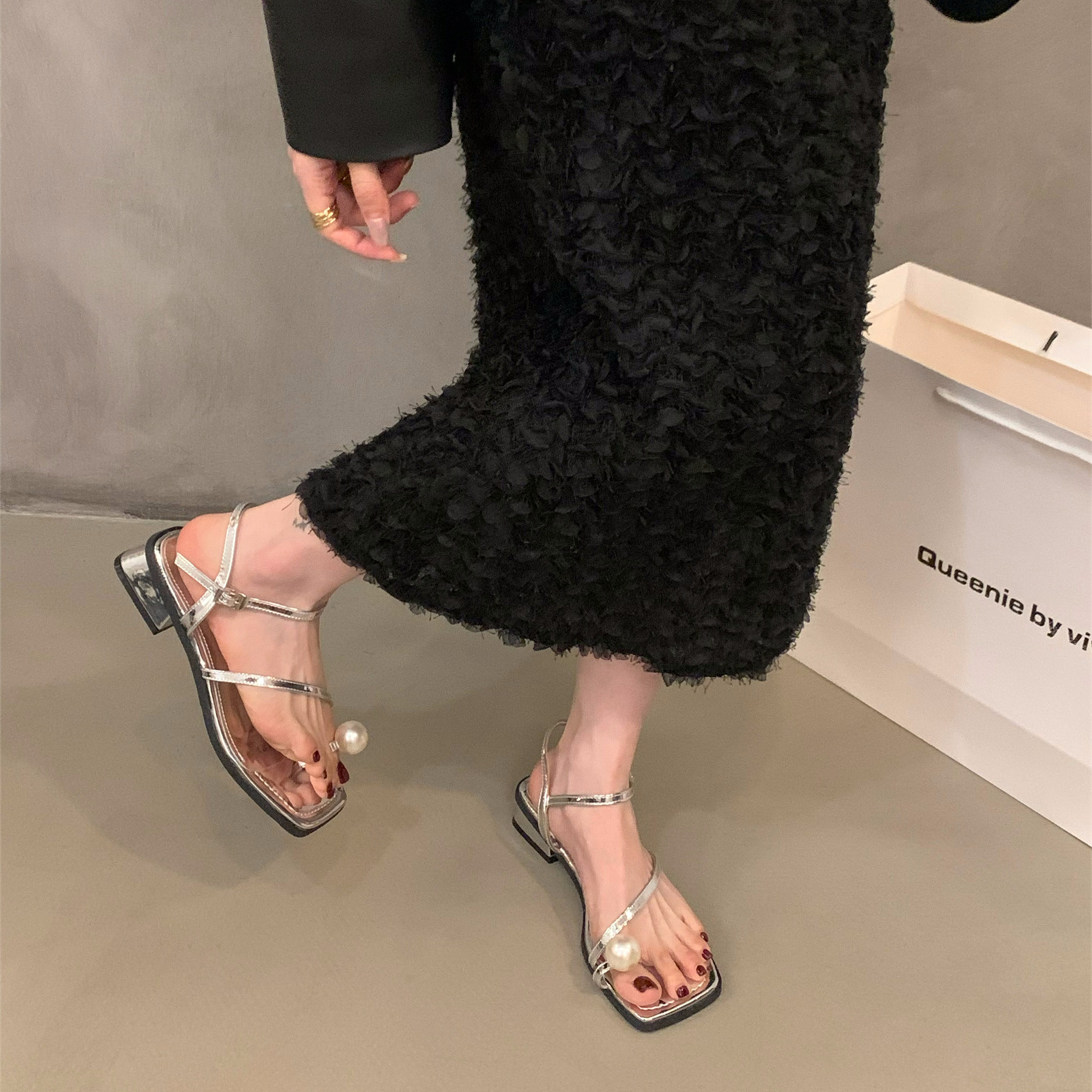 粗跟银色套趾珍珠凉鞋仙女鞋子新款夏季配裙子气质细带罗马鞋
