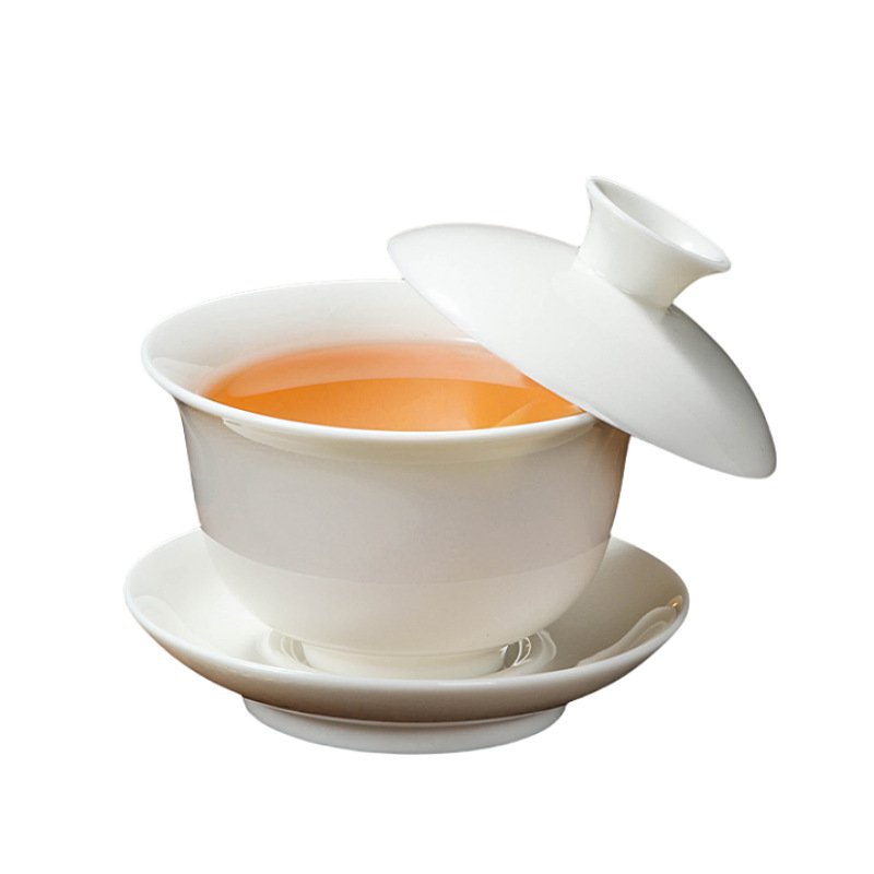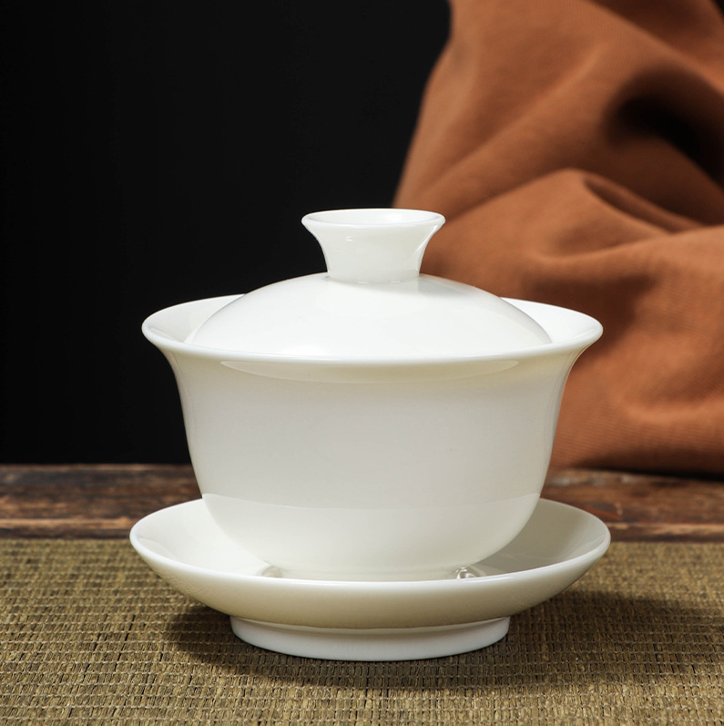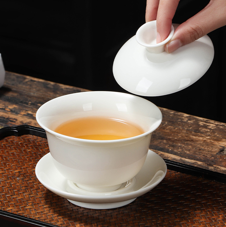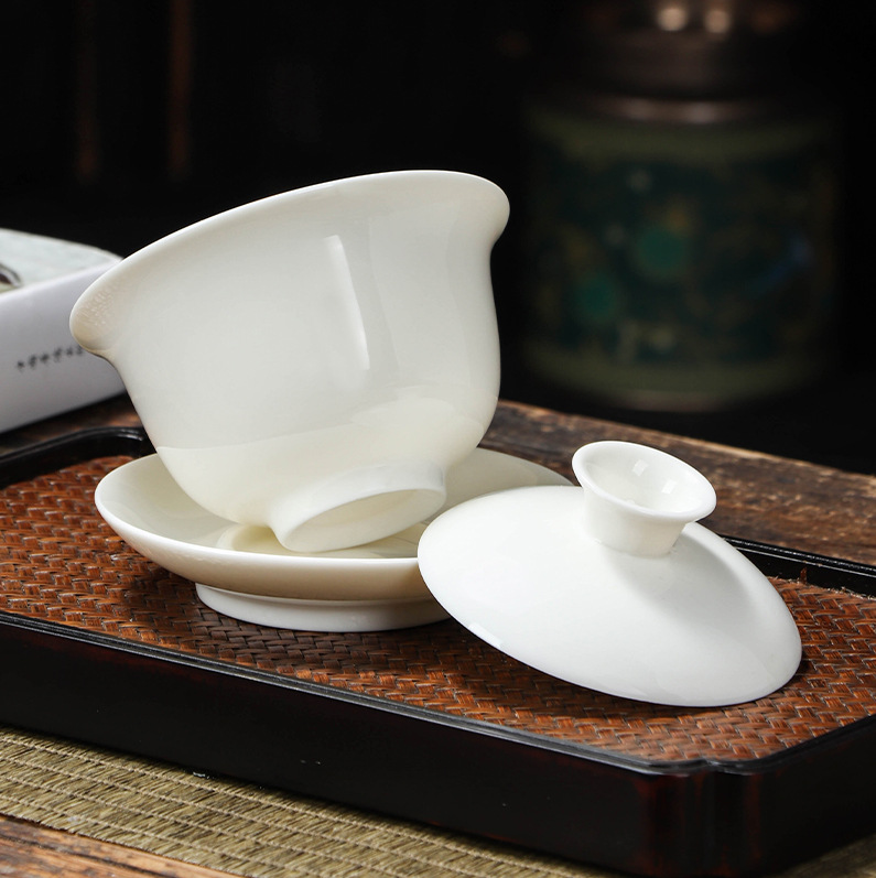 悬停羊脂玉三彩盖碗套组不烫手白瓷茶碗带盖整套功夫家用茶具套装