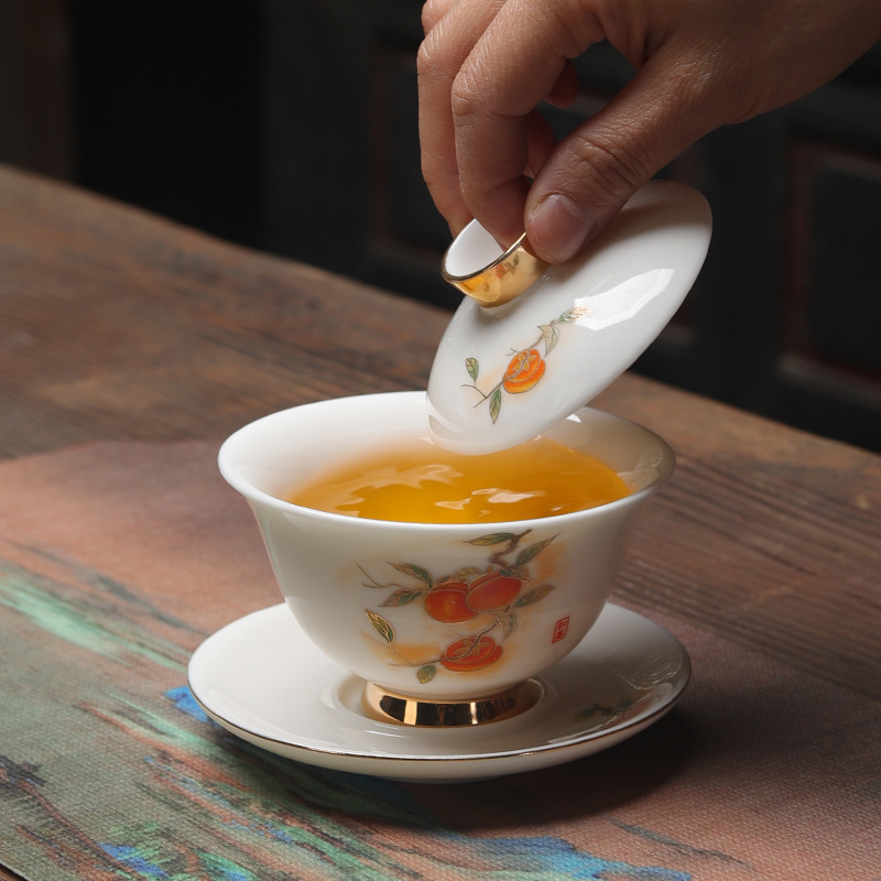 羊脂玉高档盖碗/柿子聚香款