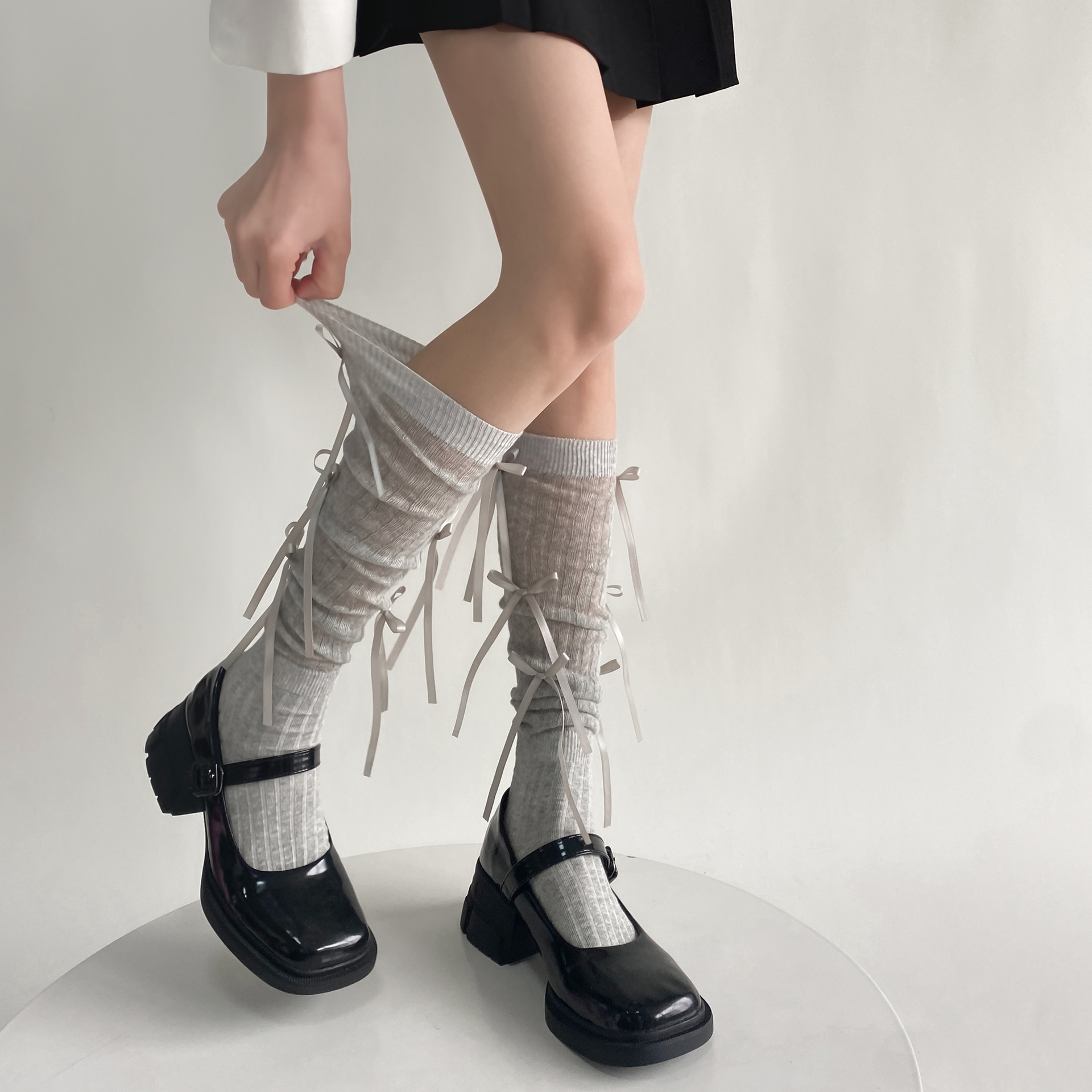 春夏芭蕾风飘带蝴蝶结过膝堆堆袜女小众设计拼接甜美学院风小腿袜