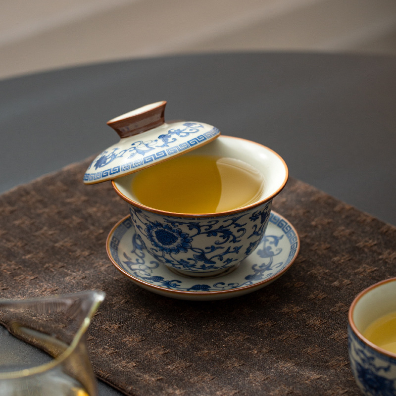 青花缠枝三才盖碗米黄汝窑高档悬停盖碗家用不烫手开片泡茶器茶杯