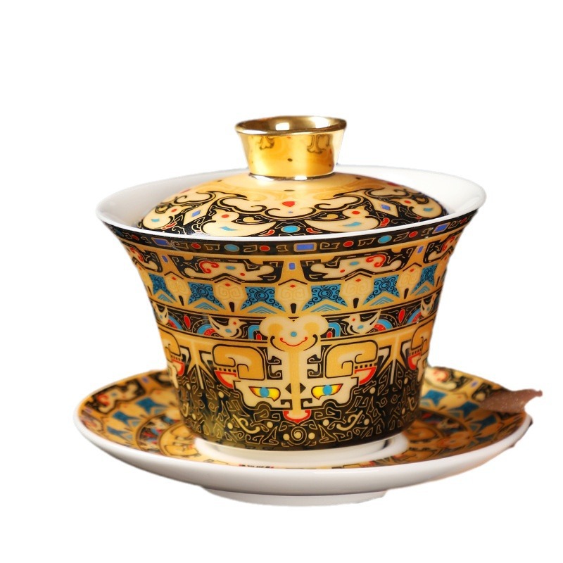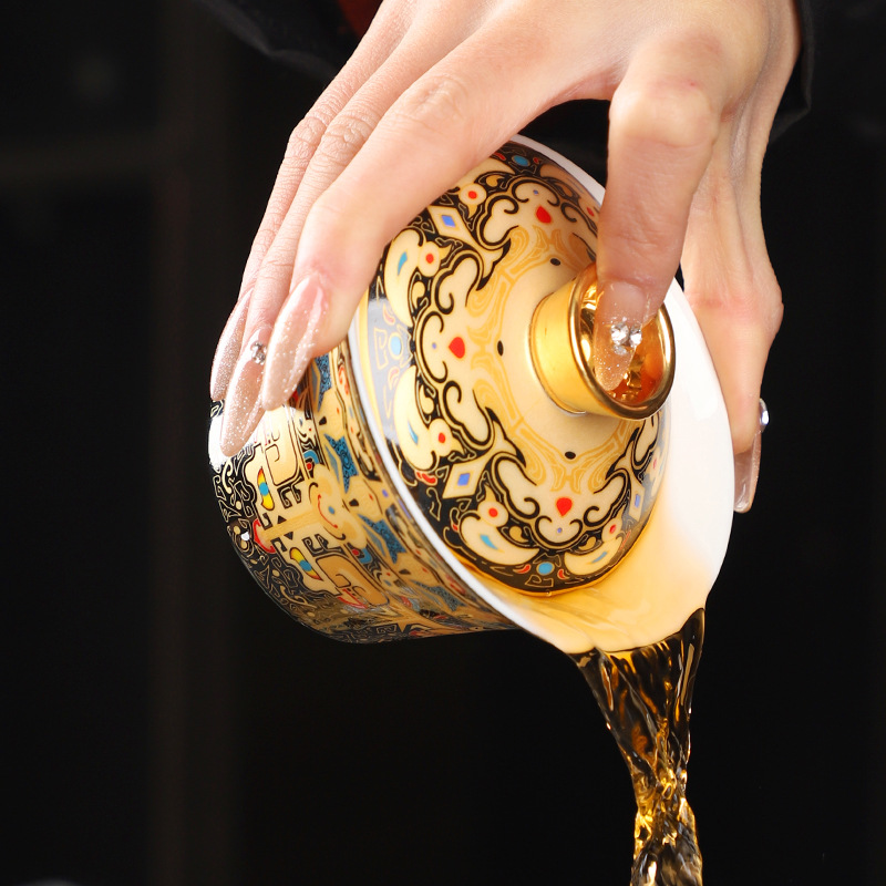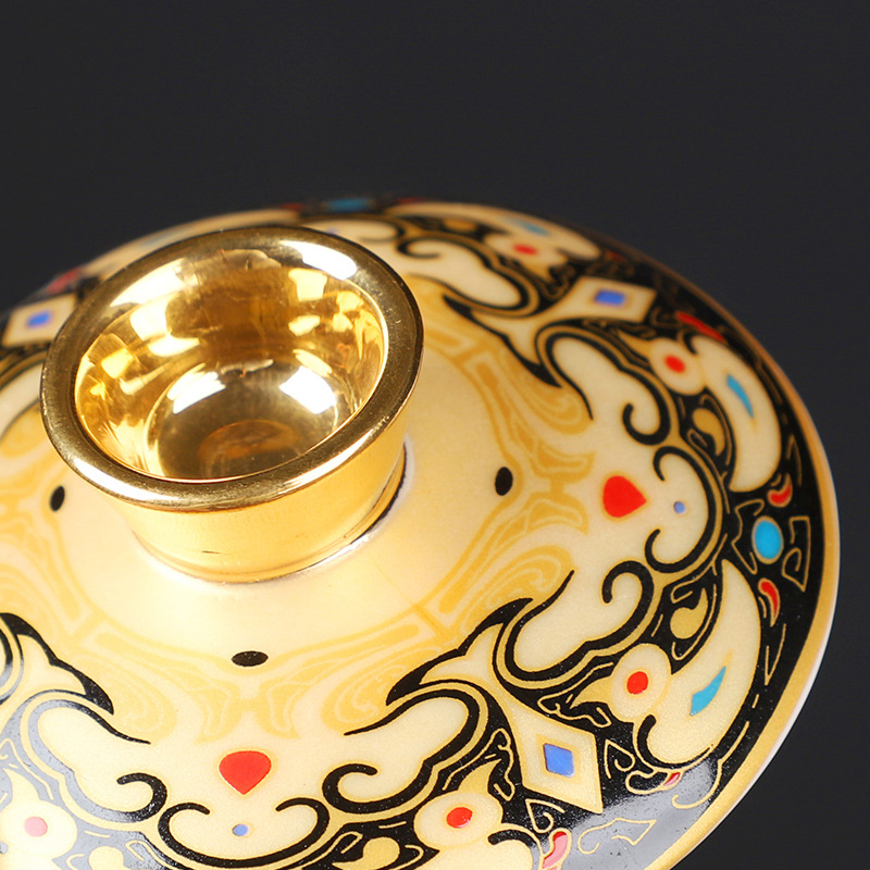 可悬停三才盖碗金银错可旋转泡茶碗陶瓷把玩青花茶碗羊脂玉