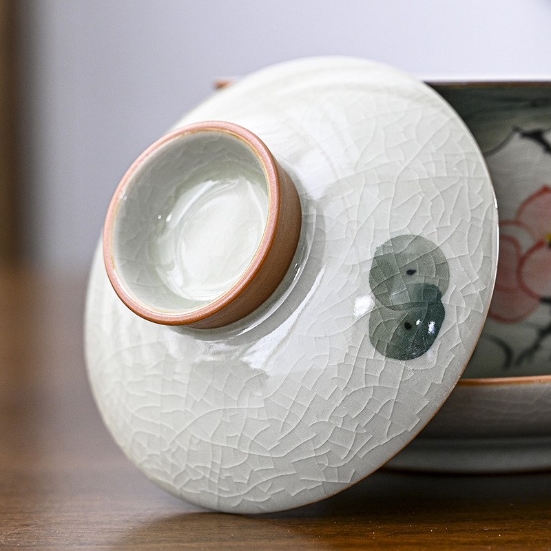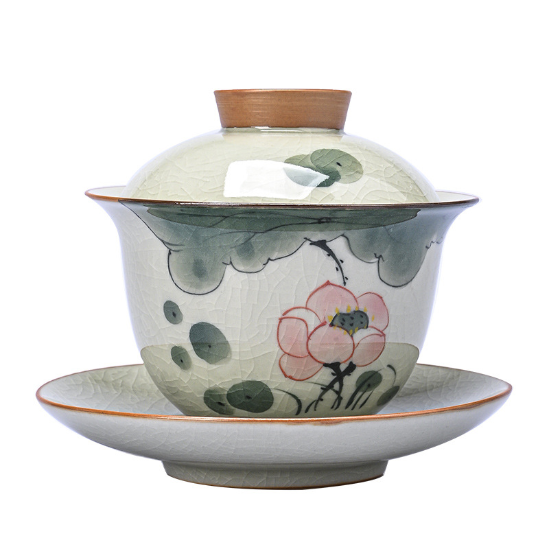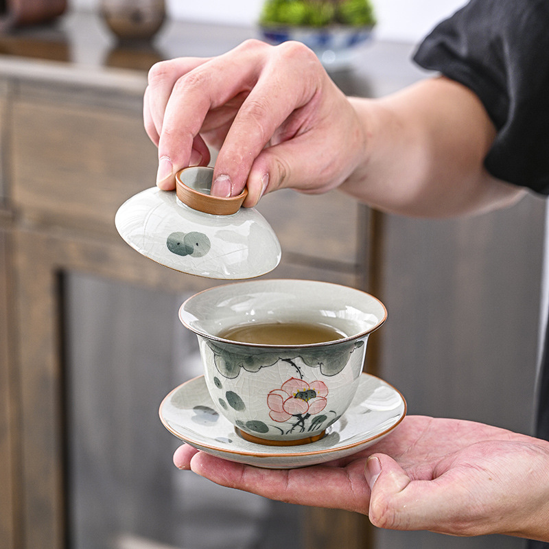 釉下彩手绘哥窑盖碗开片釉功夫茶具陶瓷三才茶碗泡茶碗