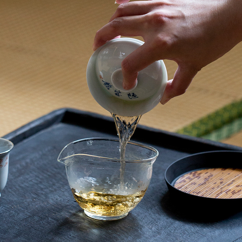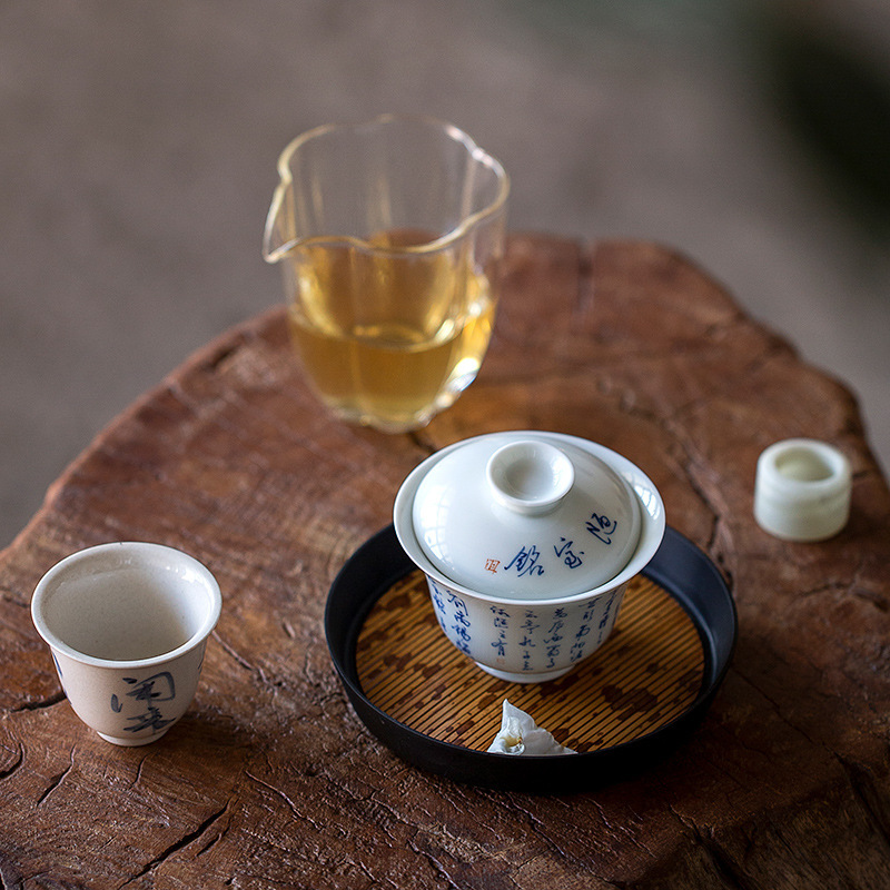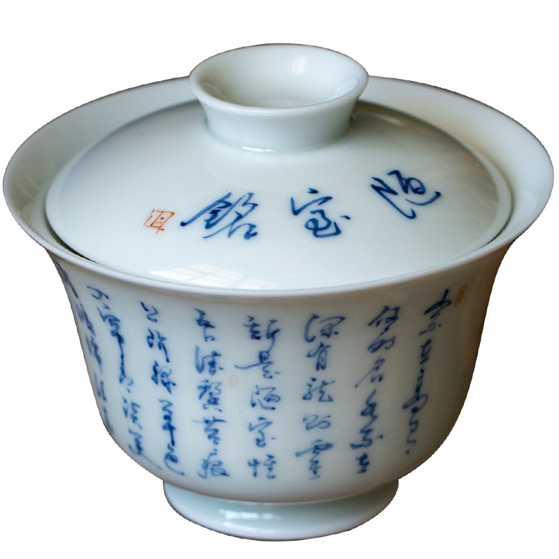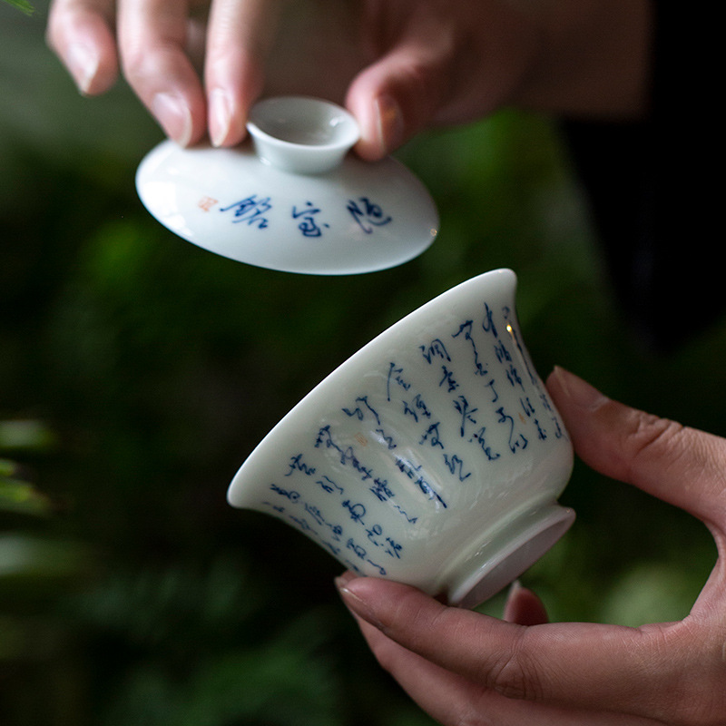 手绘陋室铭盖碗陶瓷功夫茶具中式青花诗文泡茶器手工家用二才茶碗