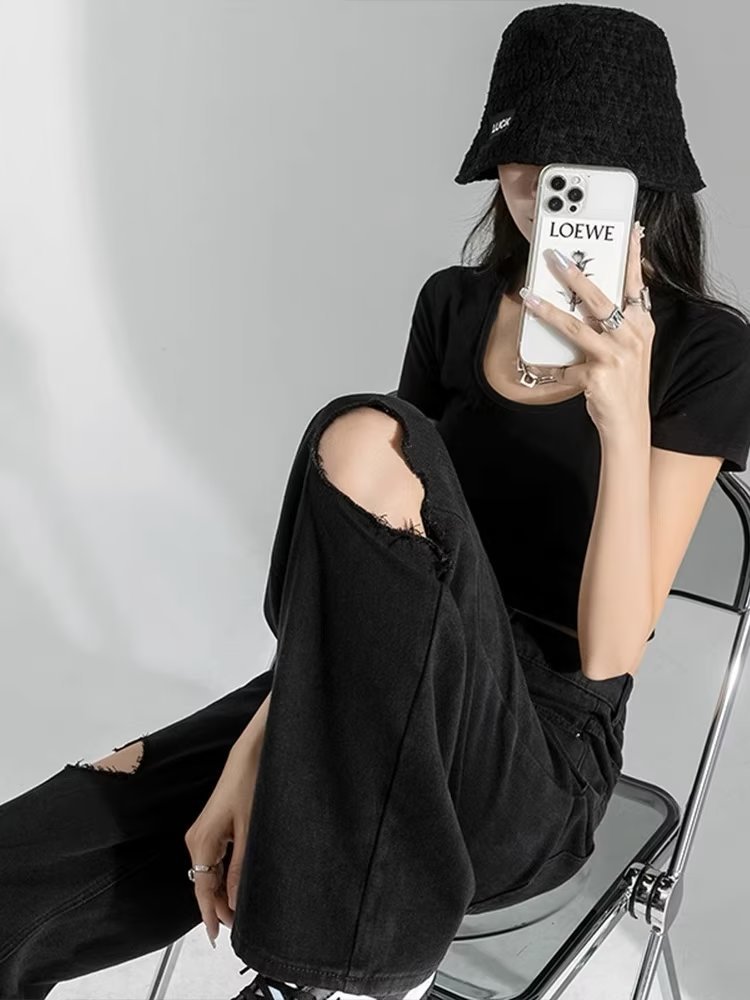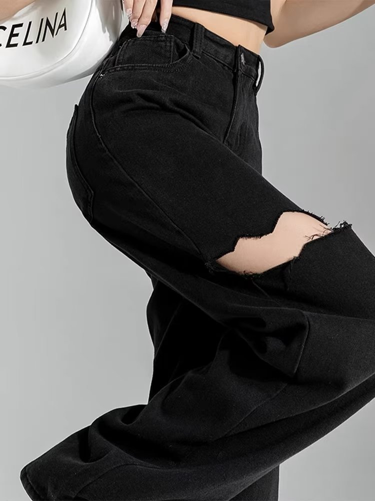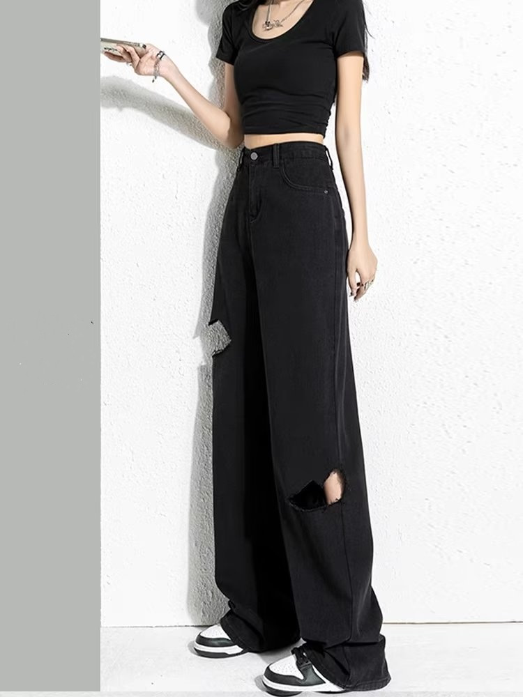黑色破洞牛仔女高街直筒乞丐春季薄款宽松垂感高腰阔腿拖地长裤潮