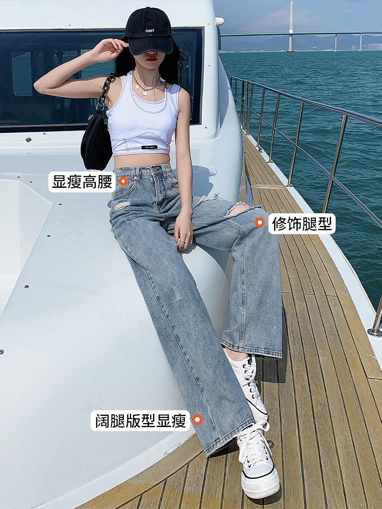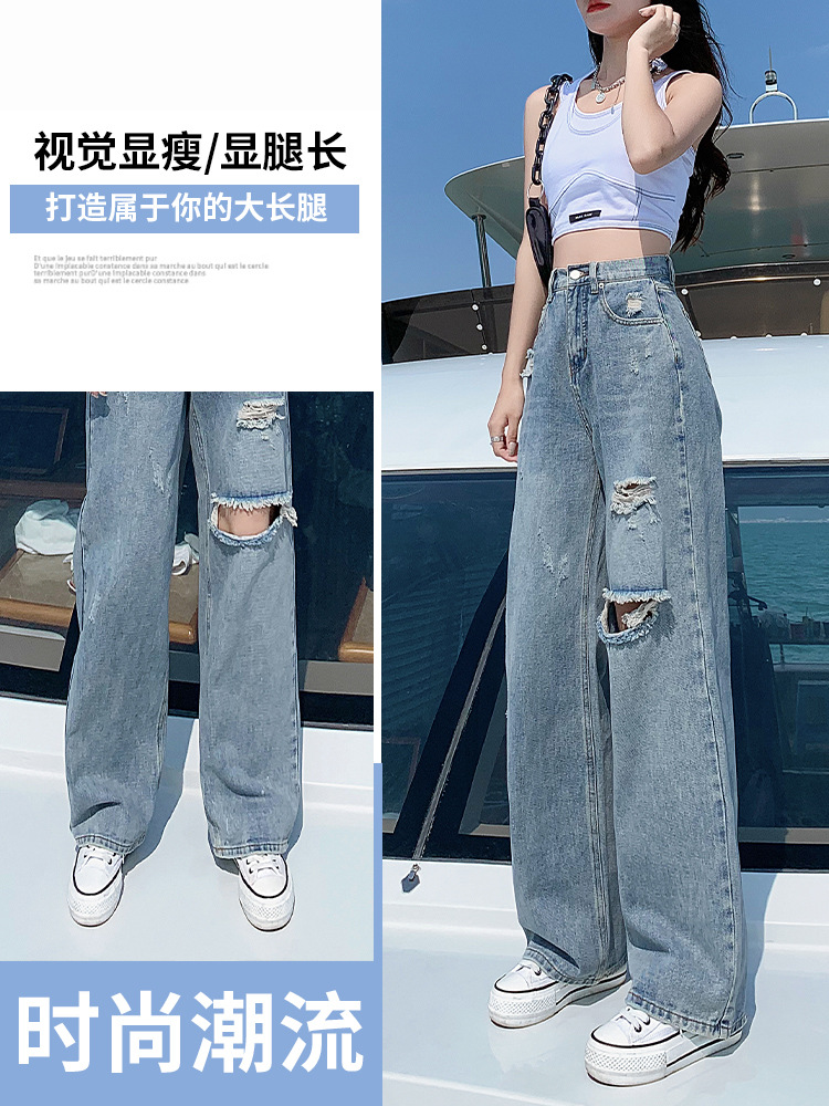 破洞牛仔裤女夏春秋新款高腰显瘦直筒垂感小个子阔腿裤ins潮