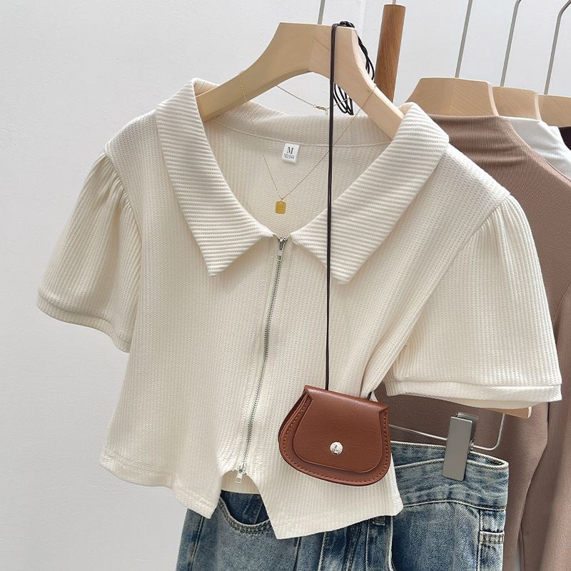 夏季美式修身显瘦正肩t恤女短袖设计感小众短款小个子双拉链上衣