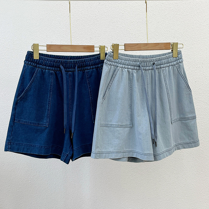U+夏季韩版薄款松紧腰遛弯棉牛仔短裤女宽松显瘦抽绳大口袋休闲裤
