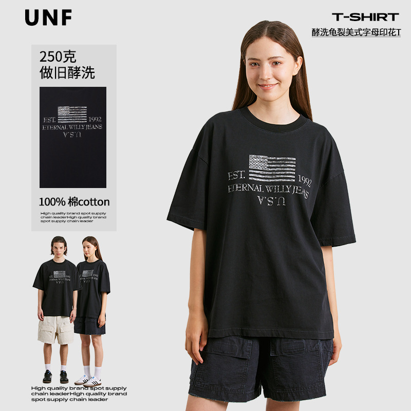 UNF 春夏新款250克潮牌复古酵洗龟裂脱落字母印花T恤圆领宽松上衣
