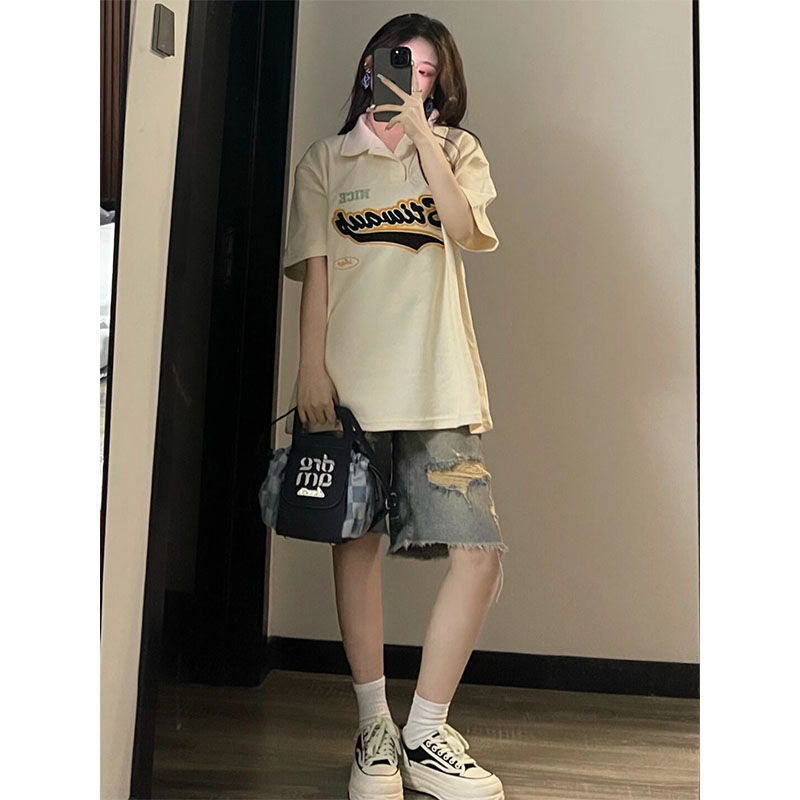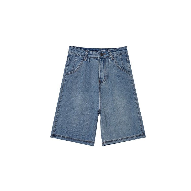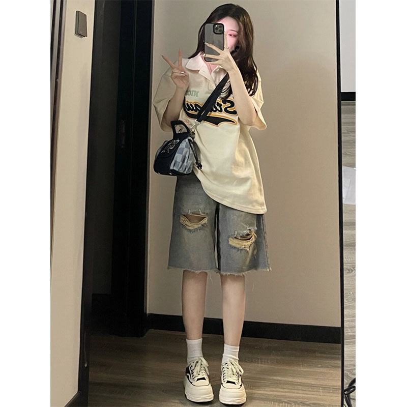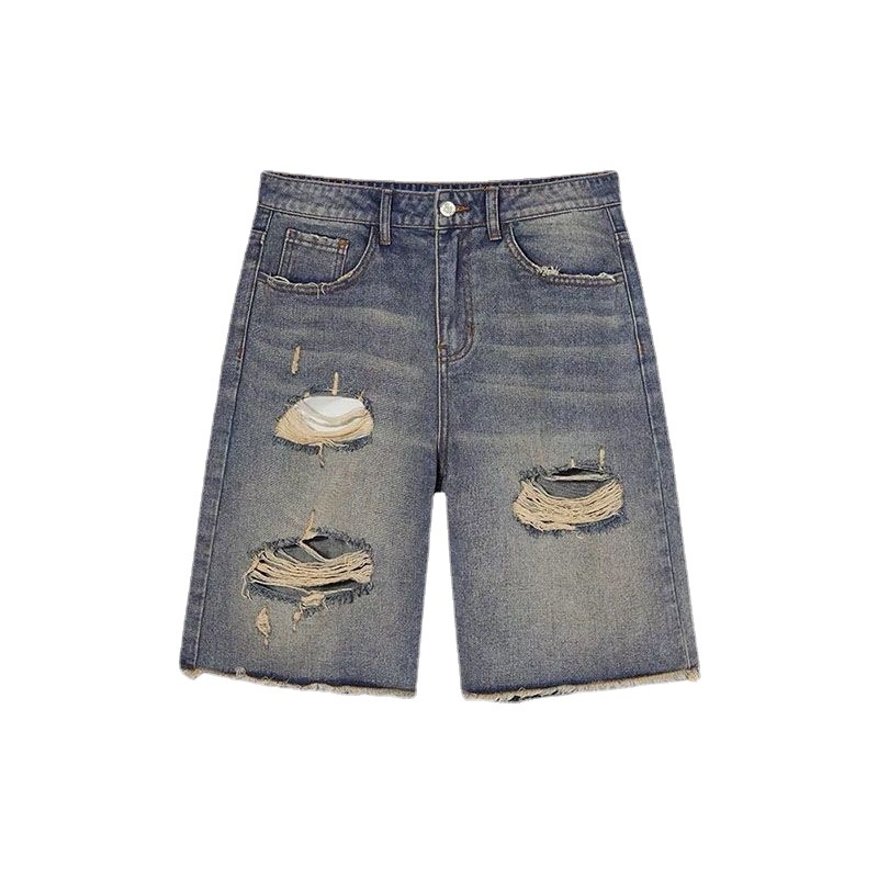 YXBB美式高街破洞牛仔五分裤女夏季新款宽松高腰直筒短裤子ins潮