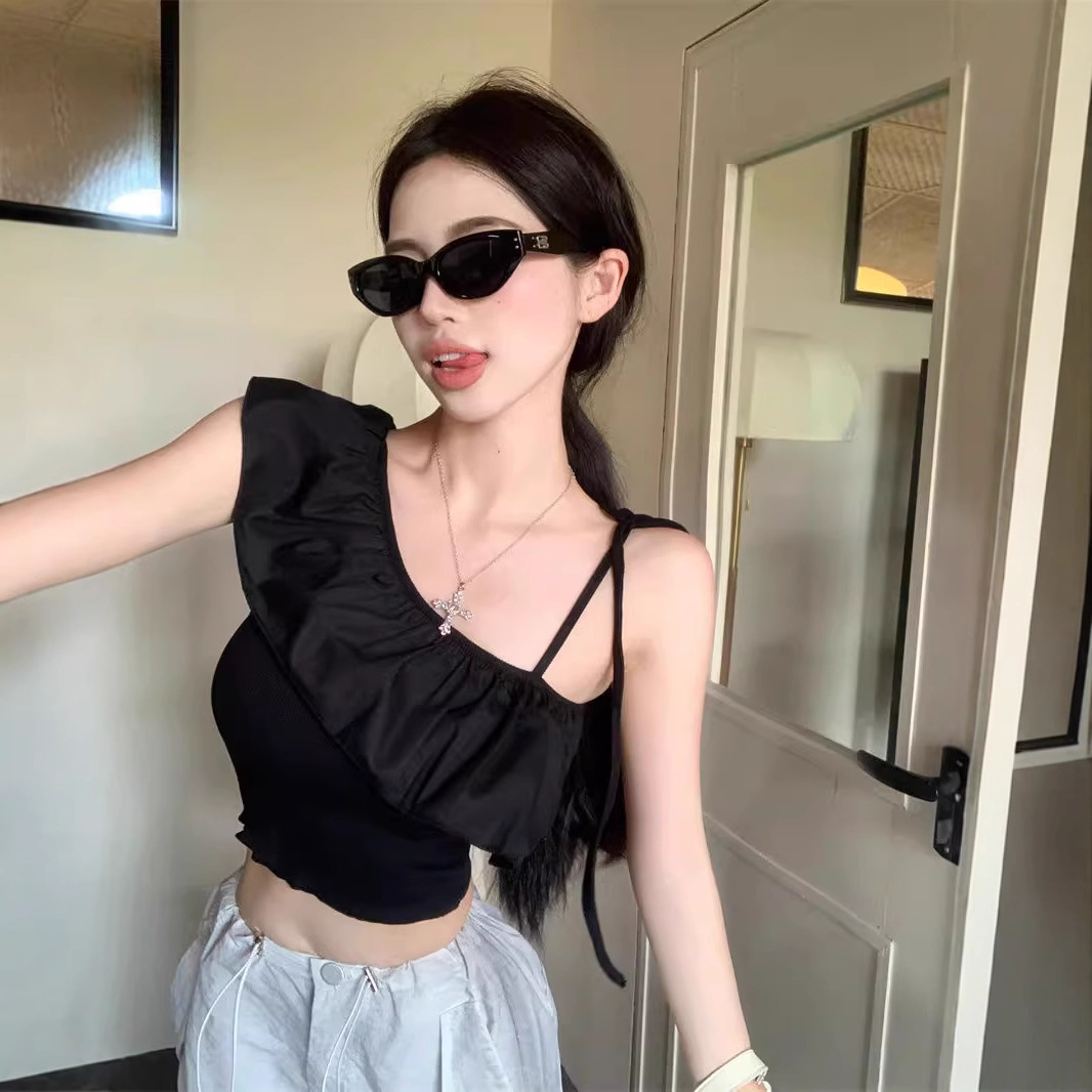 荷叶边单肩吊带背心女辣妹夏季新款t恤女纯欲风性感显瘦短款上衣