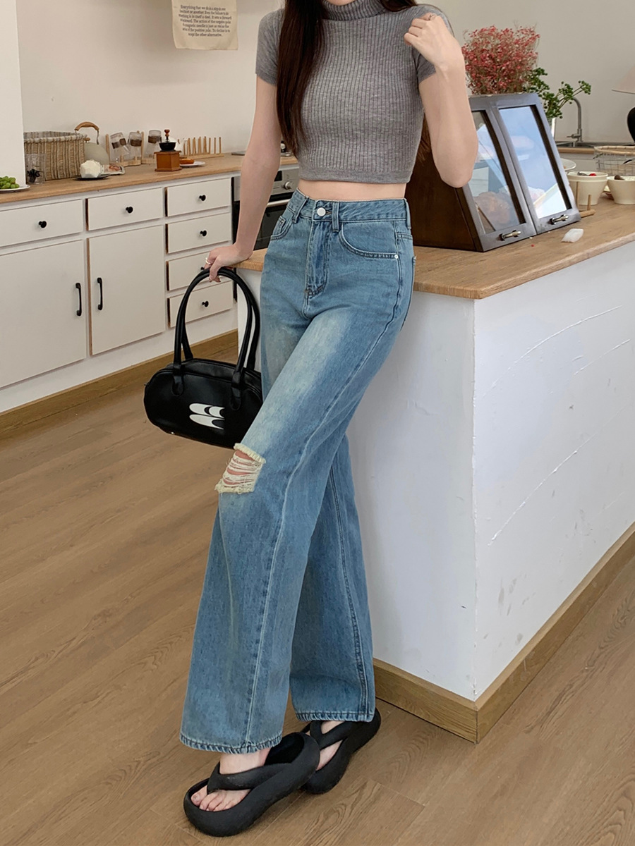 实拍高腰破洞超柔牛仔裤女春夏新款宽松高街ins洗水拖地阔腿裤潮