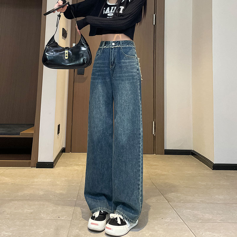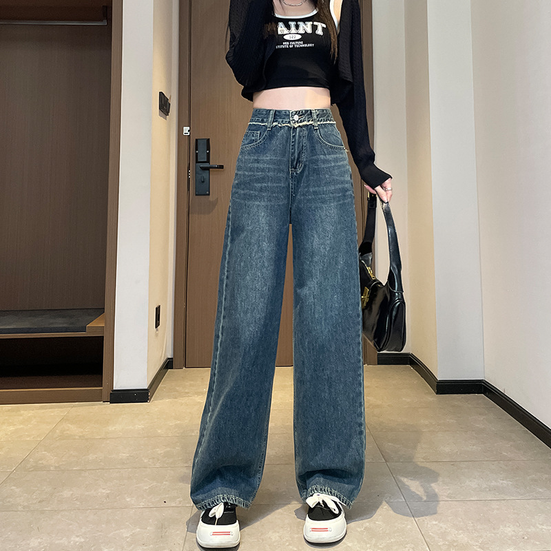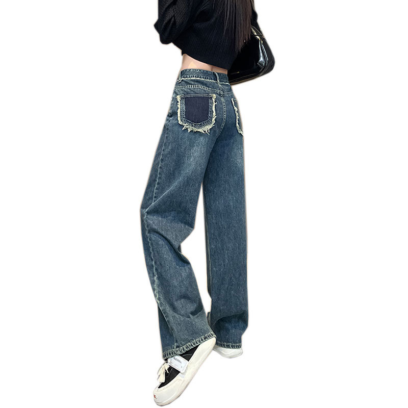 设计感拼色毛边口袋高腰春秋夏直筒宽松显瘦阔腿拖地牛仔长裤子女