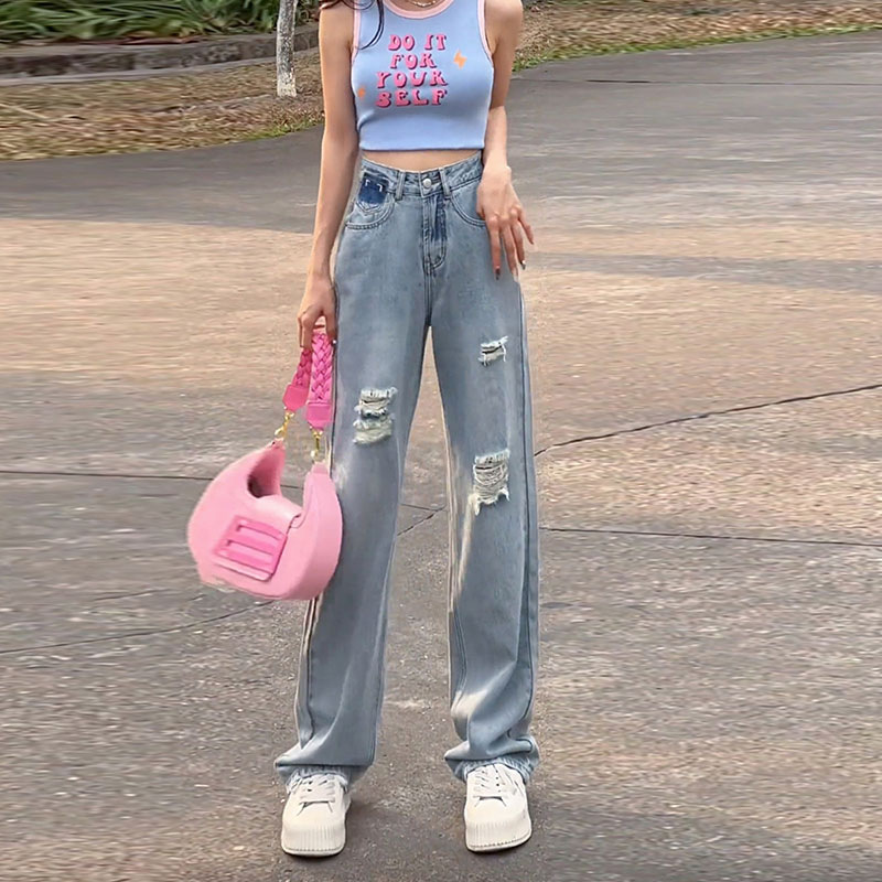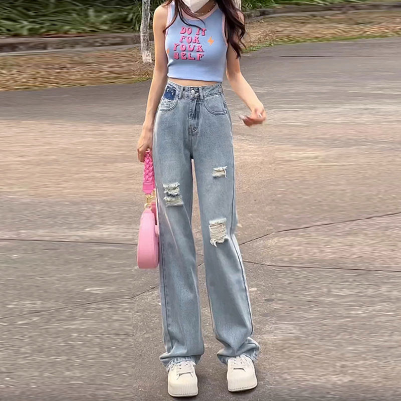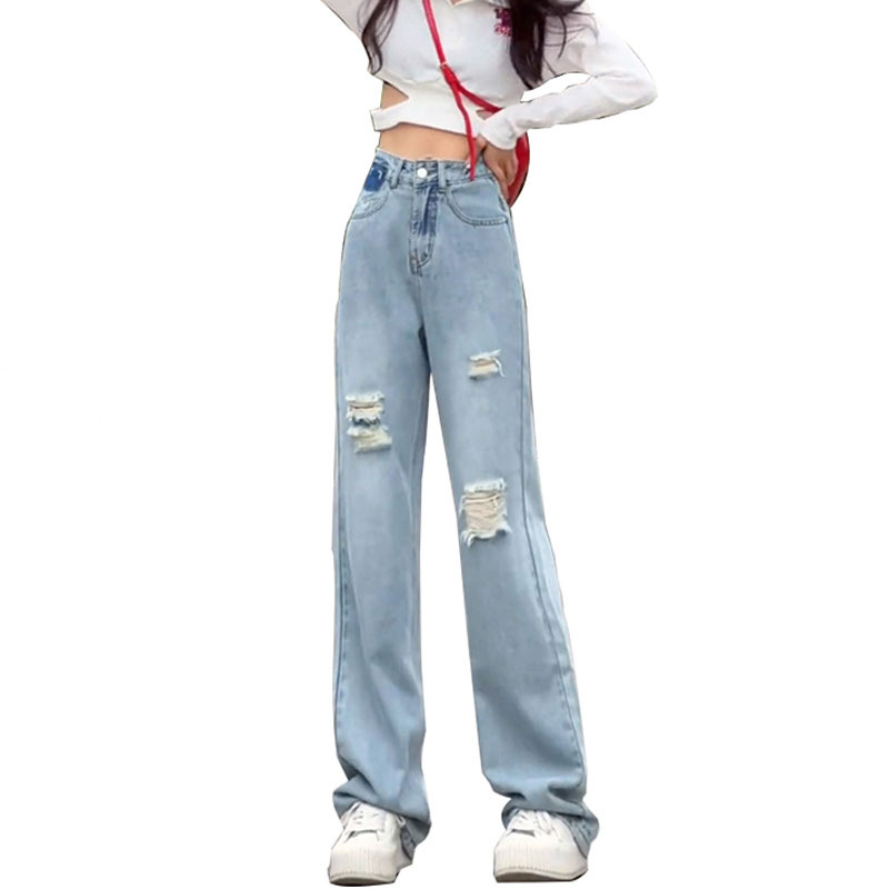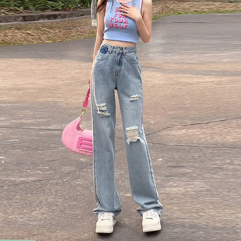 窄版设计垂感阔腿牛仔裤女春夏季新款高腰宽松休闲破洞直筒长裤子
