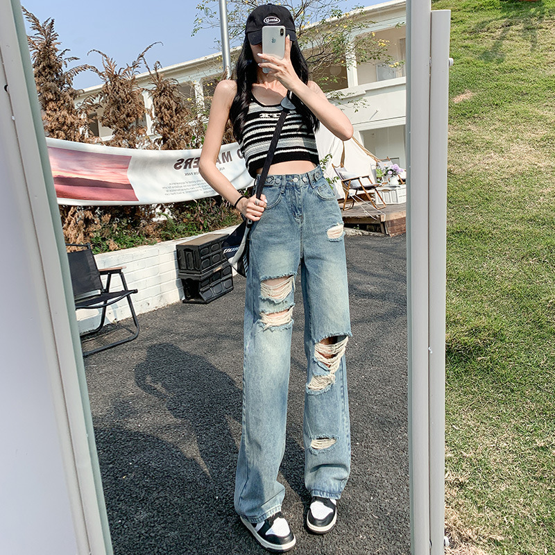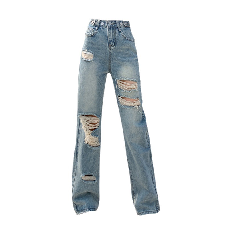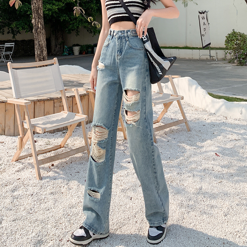 破洞阔腿牛仔裤女夏季新款宽松高腰显瘦垂感直筒拖地裤子春秋