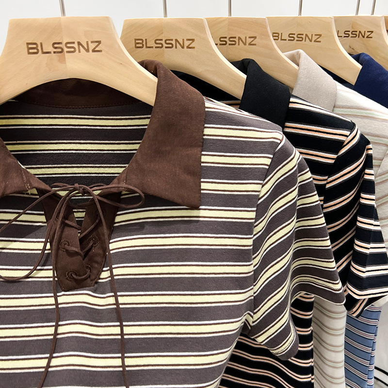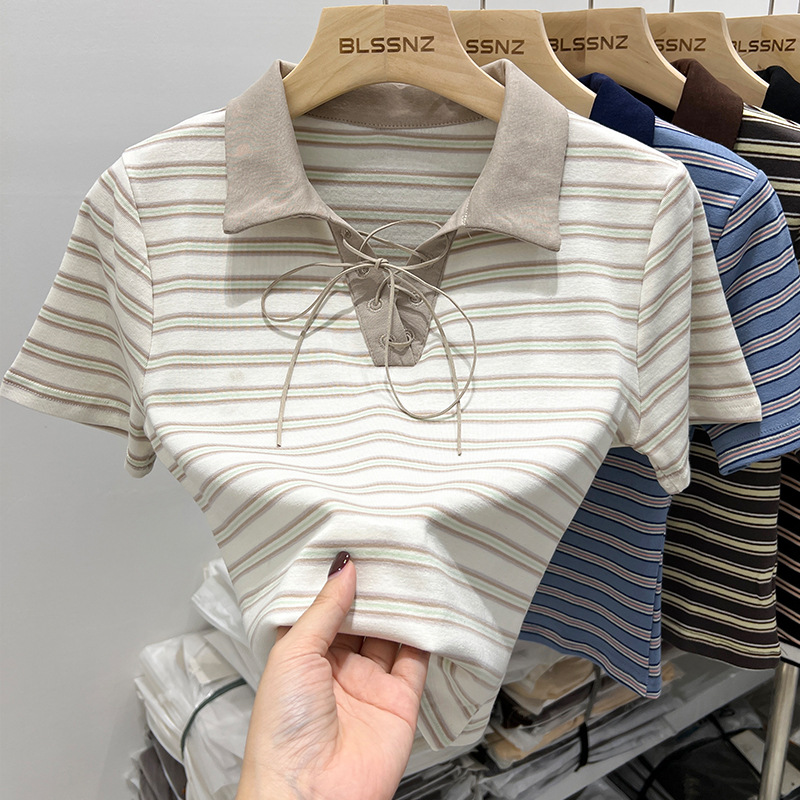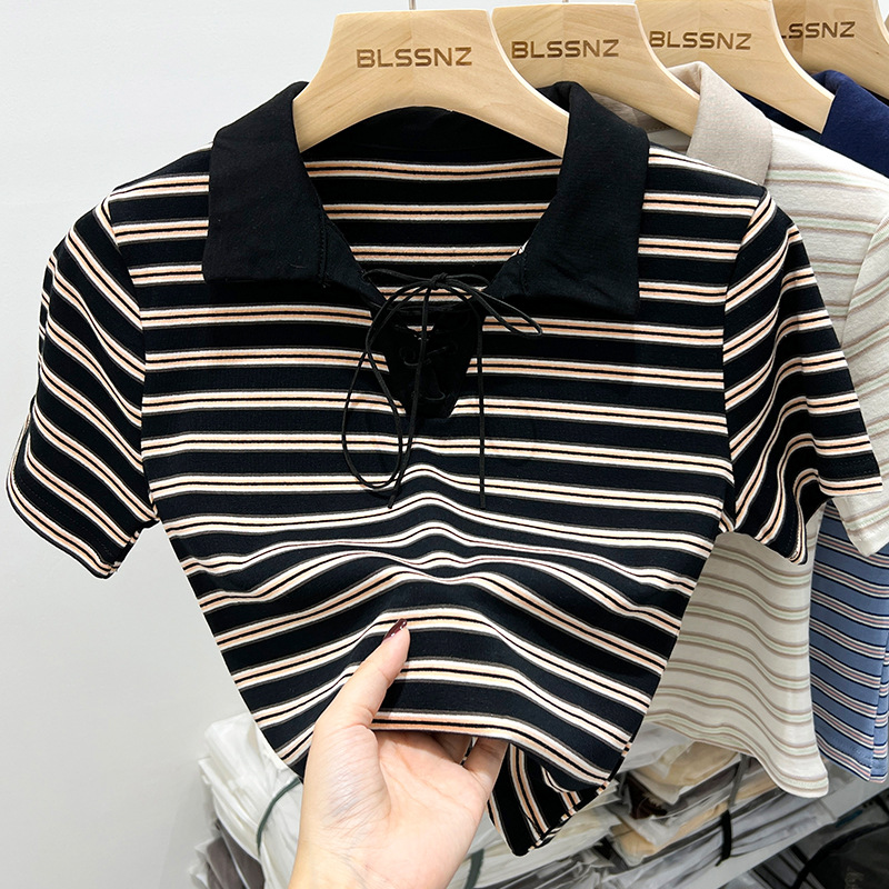 复古短款t恤女夏polo衫绑带设计感上衣修身显瘦条纹短袖