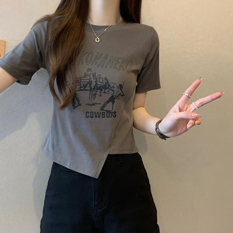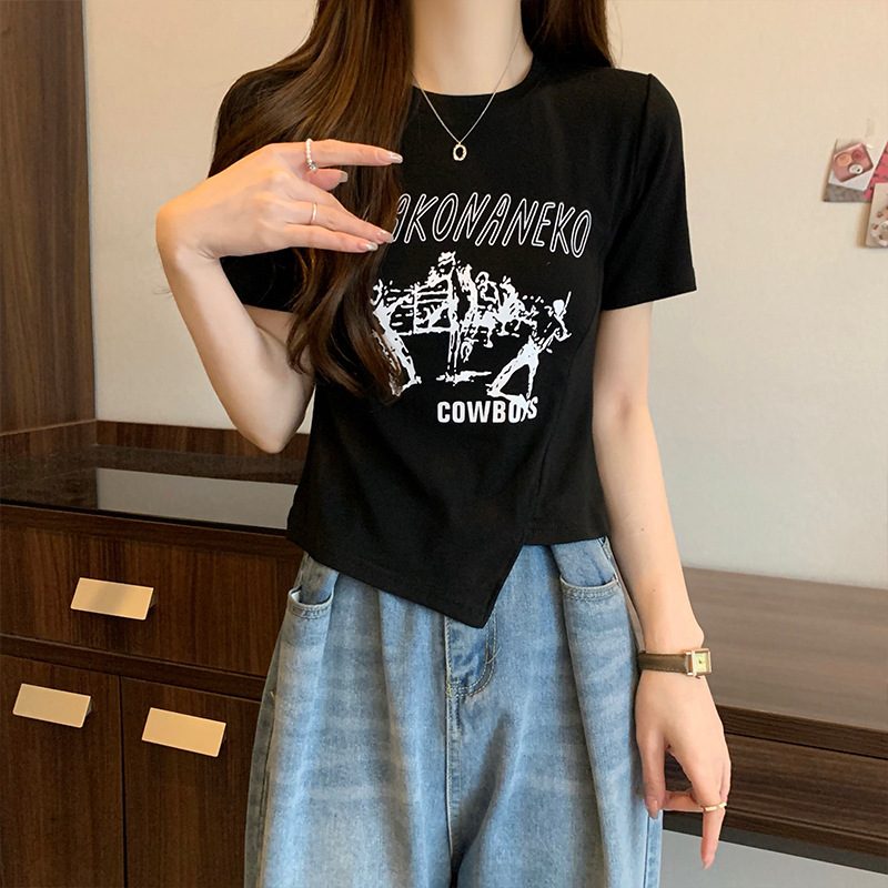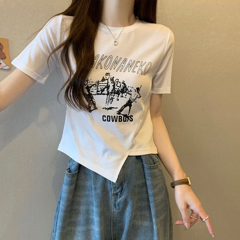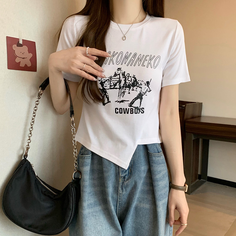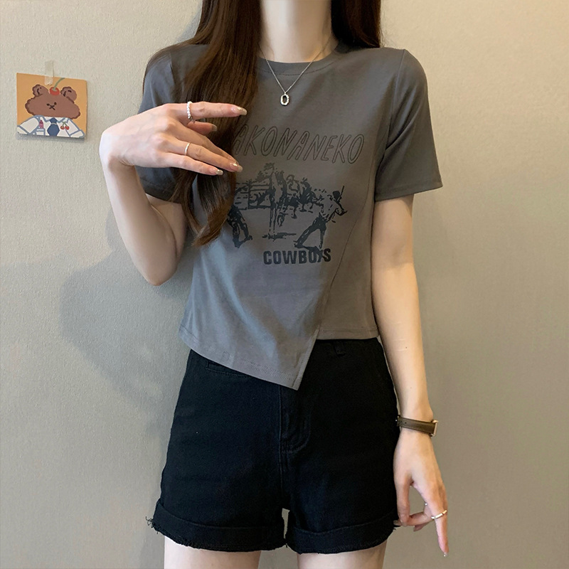 短袖t恤女ins潮夏装新款印花开叉独特别致设计感辣妹短款上衣