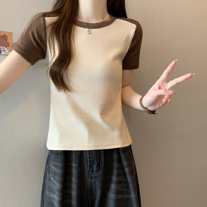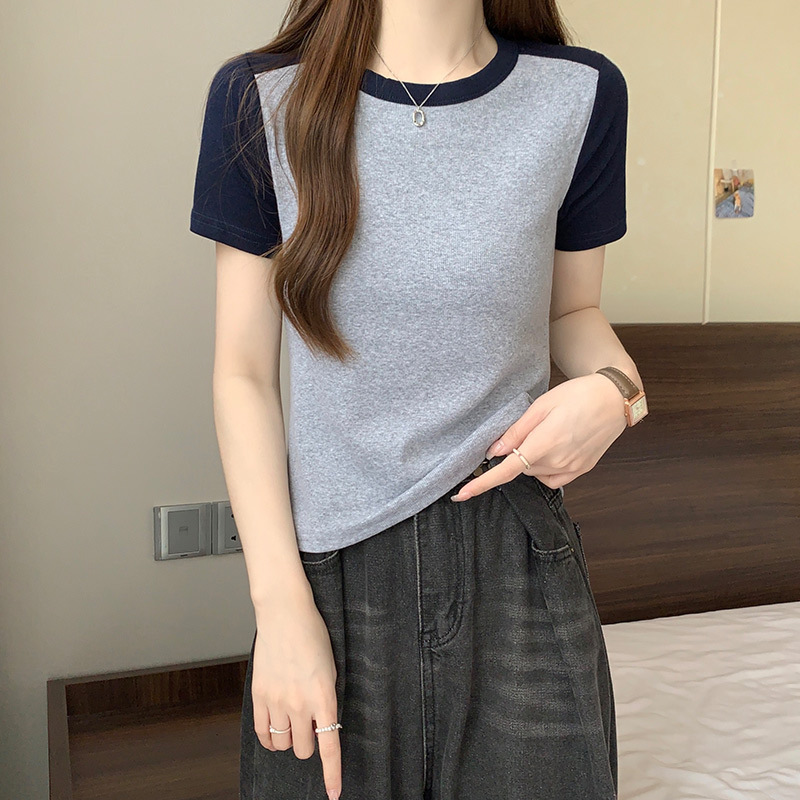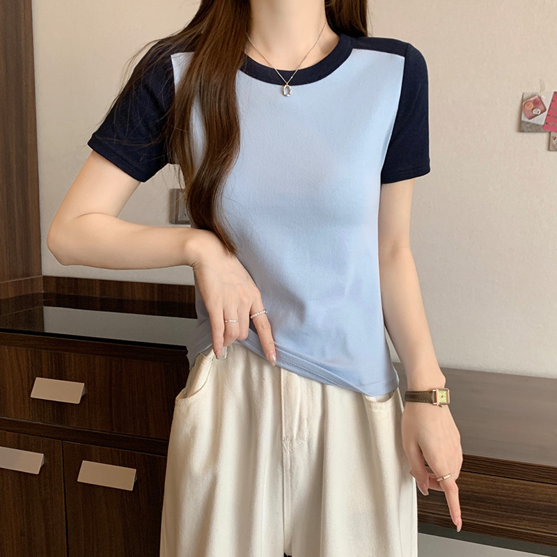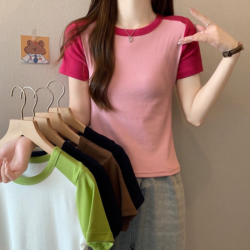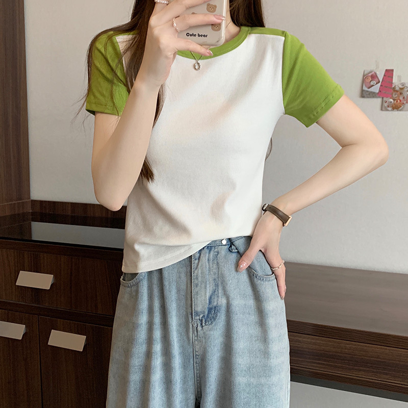 撞色短袖t恤女ins潮夏季年新款别致独特甜辣短款高腰上衣