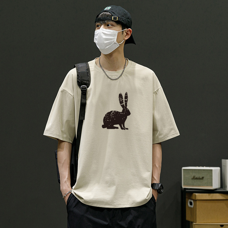 夏季情侣套头圆领短袖T恤男士兔子休闲宽松重磅落肩白色港风打底t