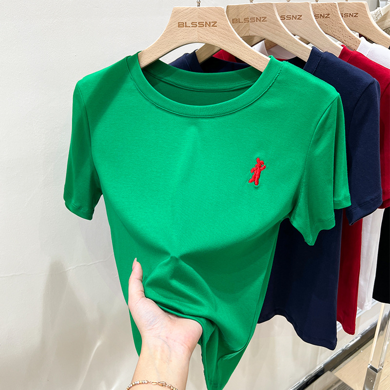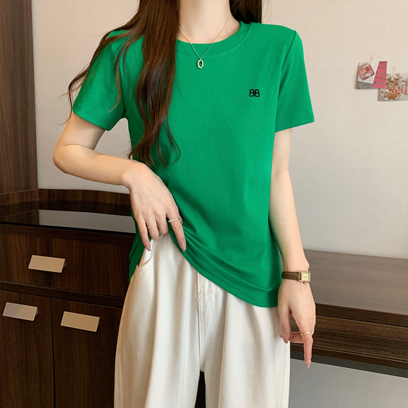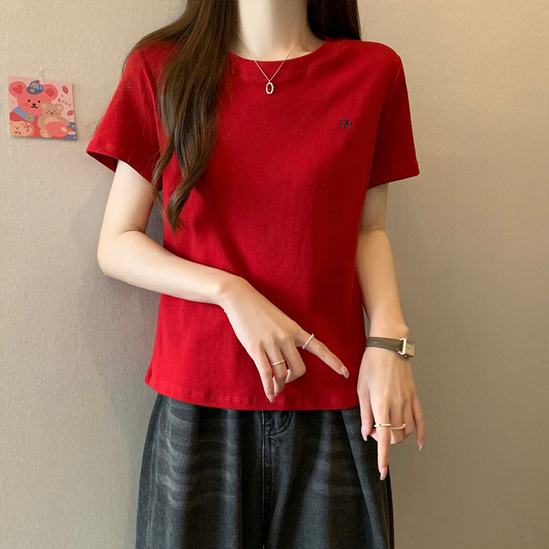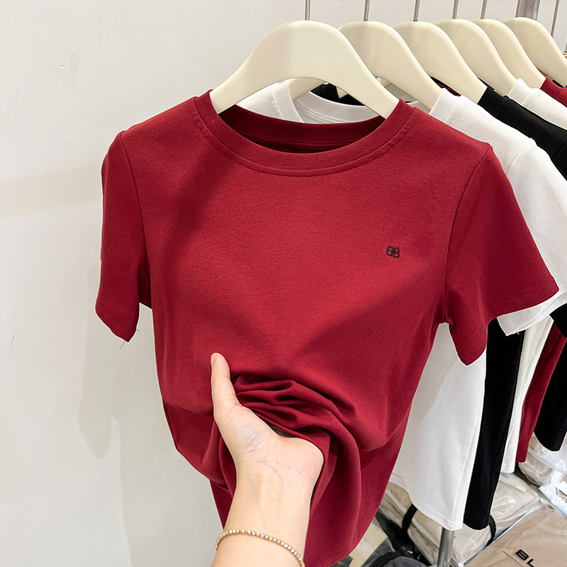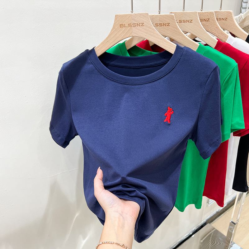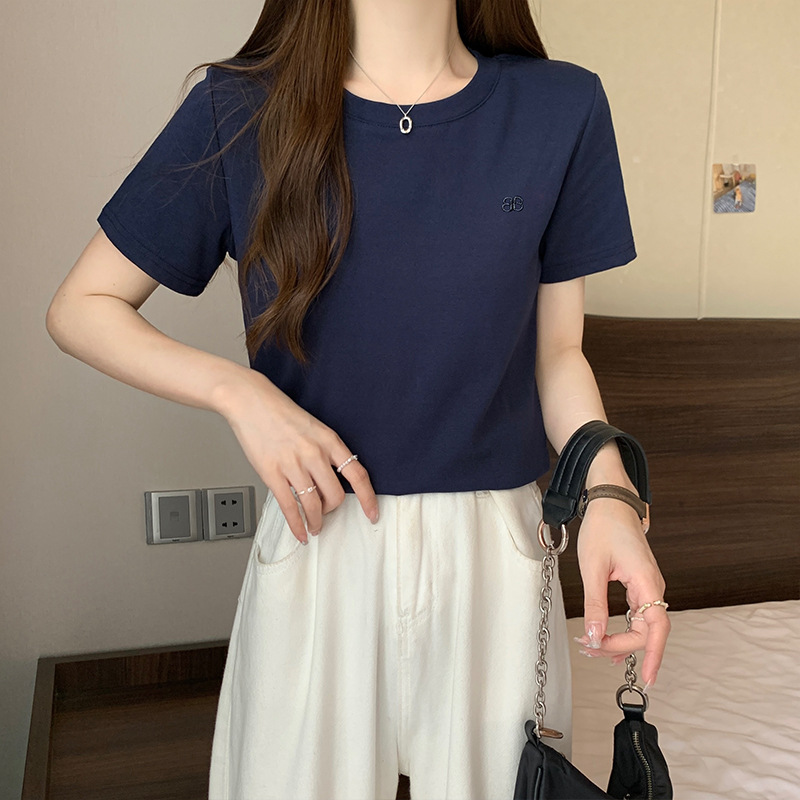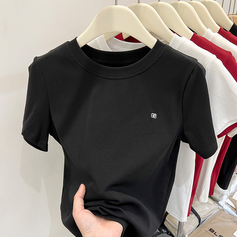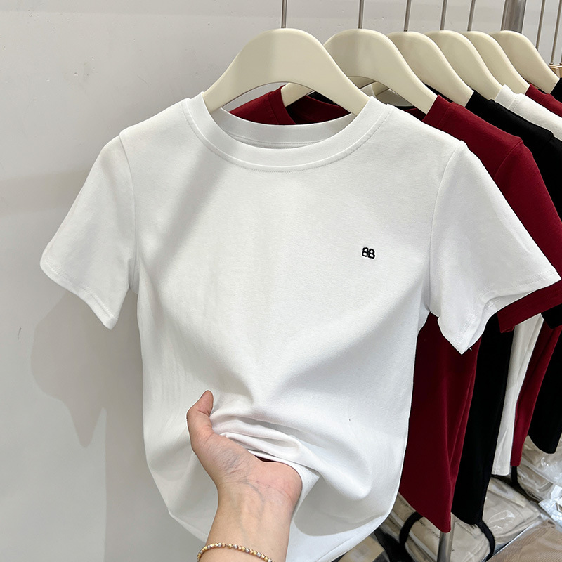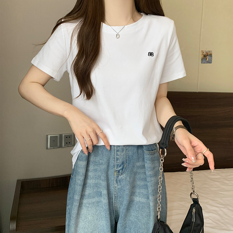 纯棉白色t恤女独特正肩小衫夏装新款设计感圆领短袖上衣刺绣