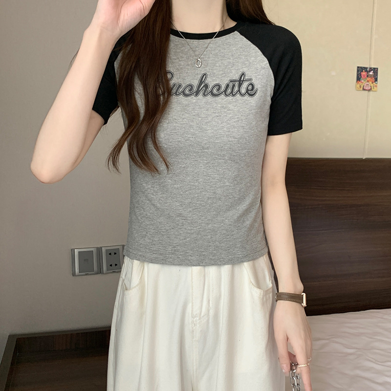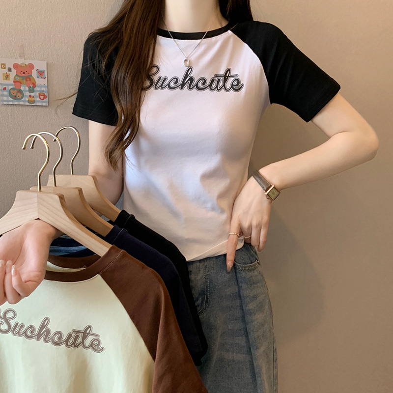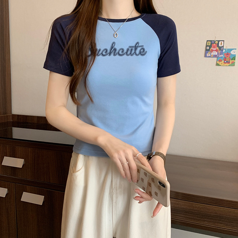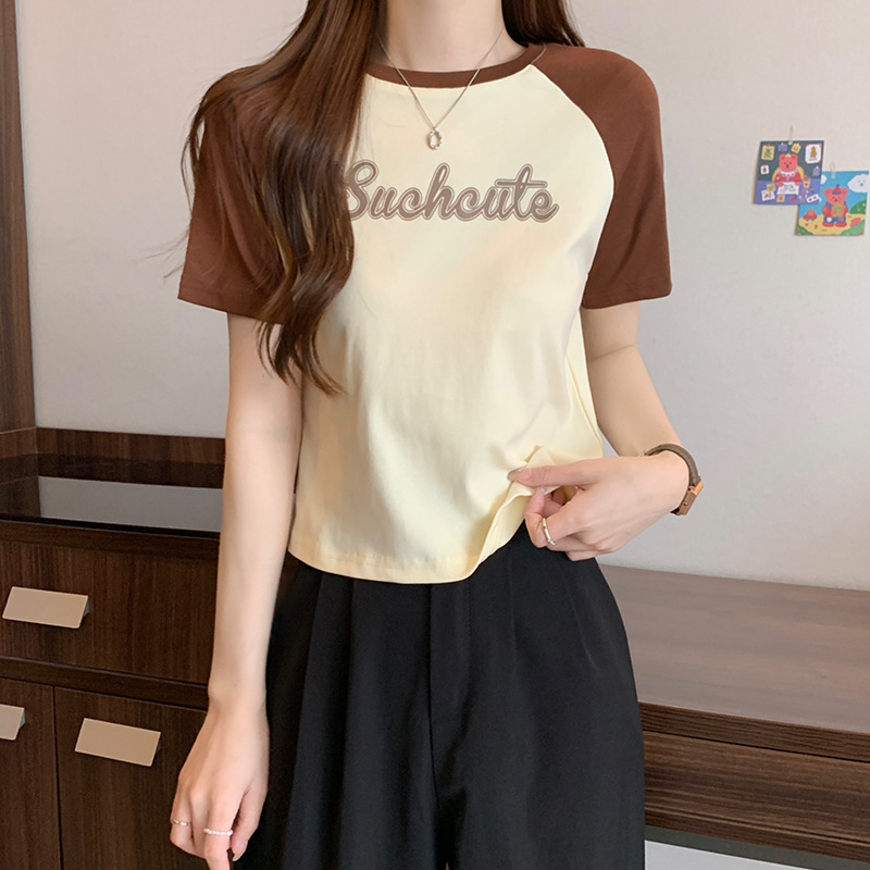 美式复古撞色短袖女t恤夏季设计感小个子甜辣妹短款别致上衣