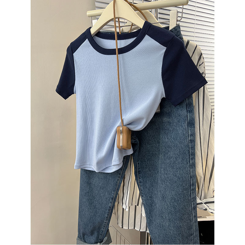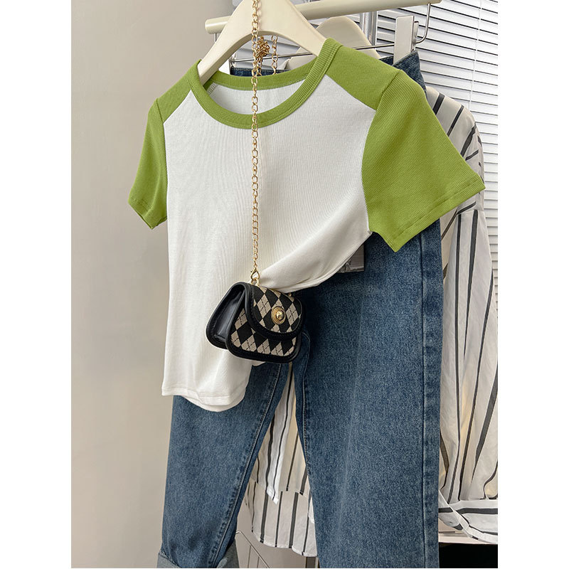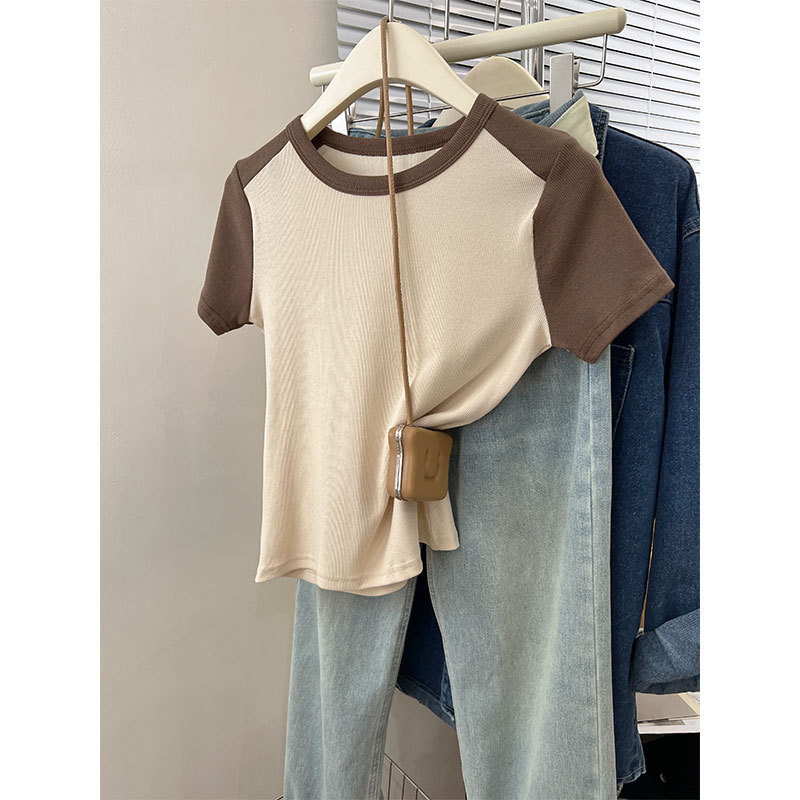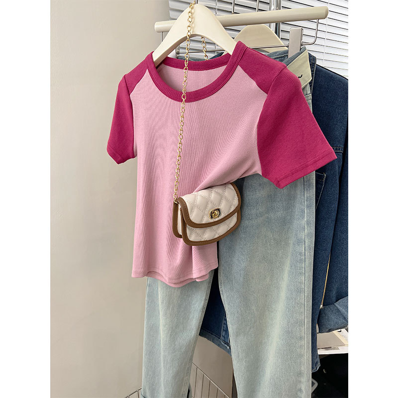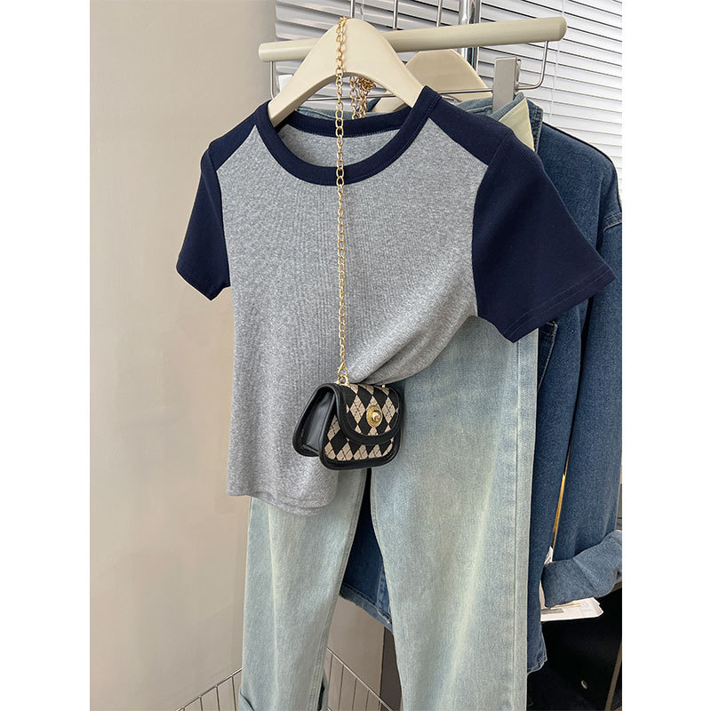 撞色短袖t恤女ins潮夏季年新款别致独特甜辣短款高腰上衣