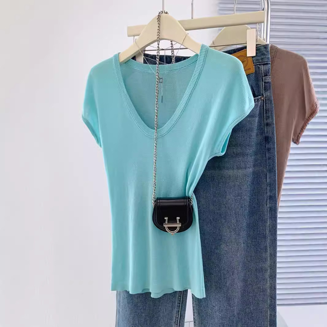 显白奶油蓝U领针织衫短袖女夏季新款冰丝小飞袖修身显瘦洋气上衣