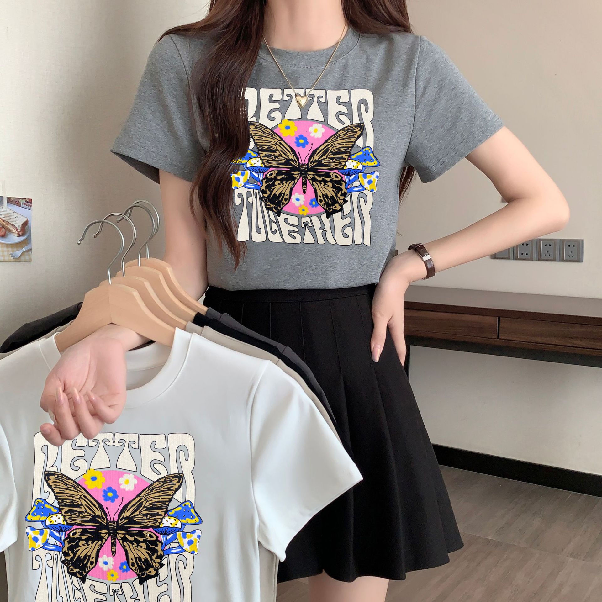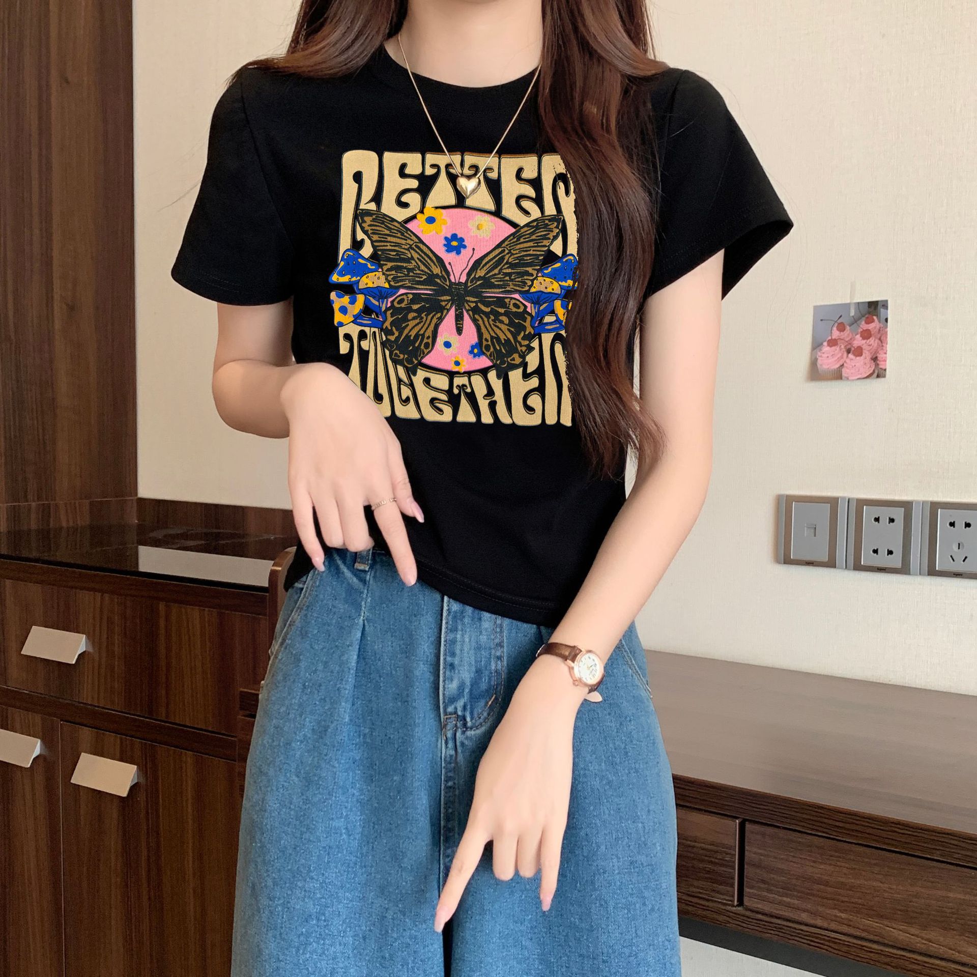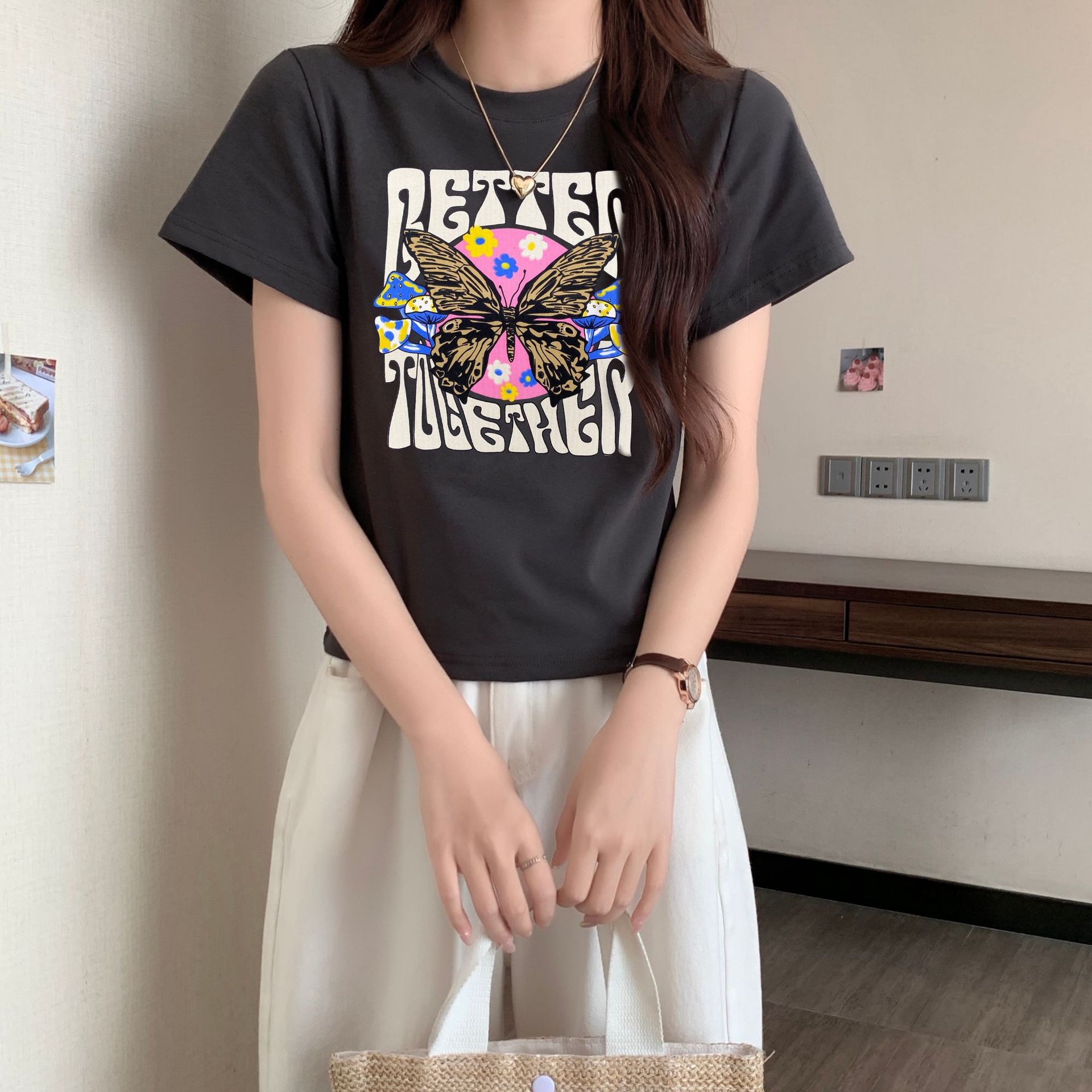 复古印花正肩短袖t恤女夏季设计感短款小个子上衣夏