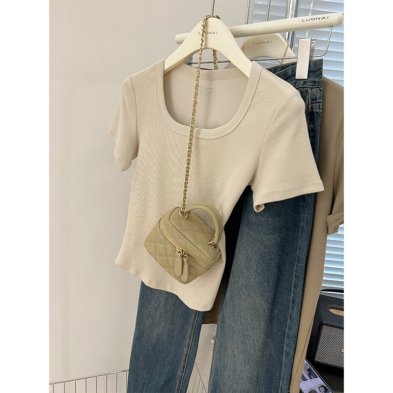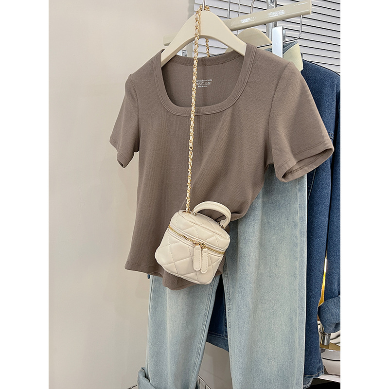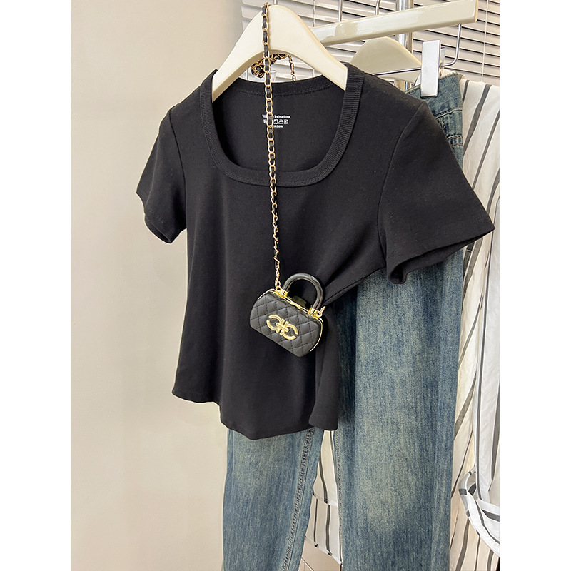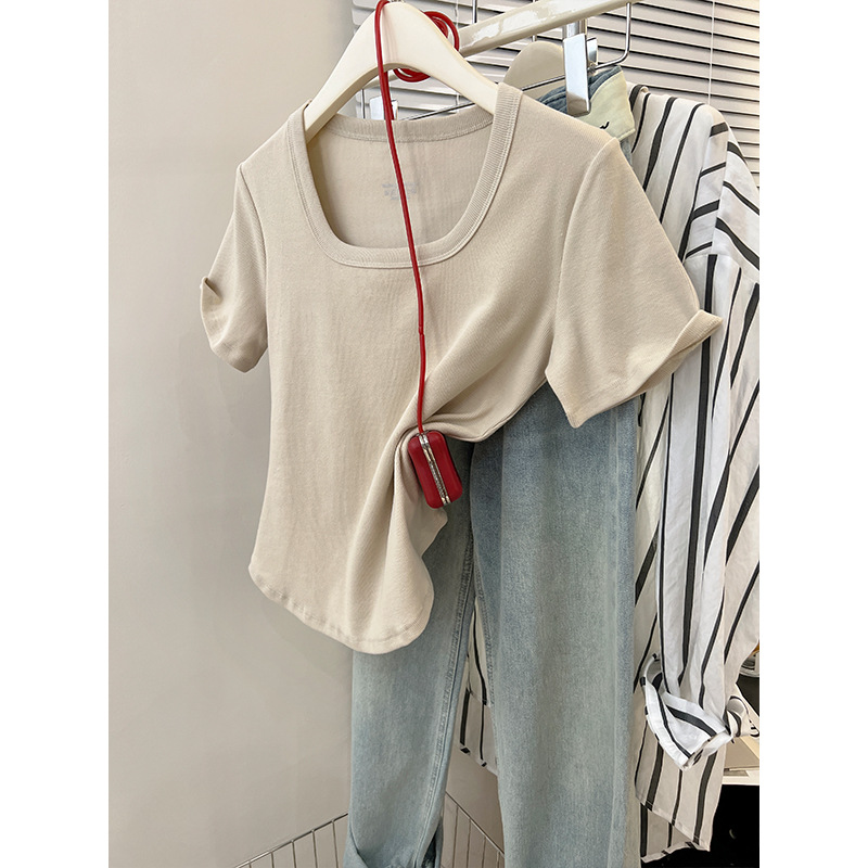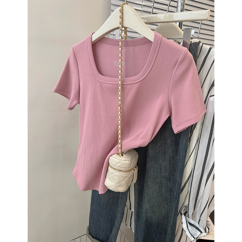 短袖t恤女夏季新款甜辣显瘦修身方领短款上衣女体恤