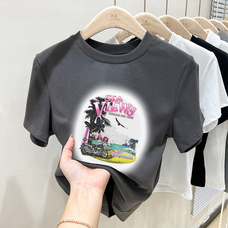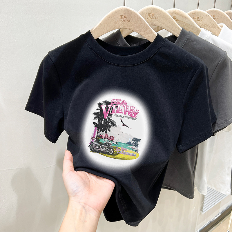 美式复古印花正肩短袖t恤女夏季设计感小个子短款上衣潮