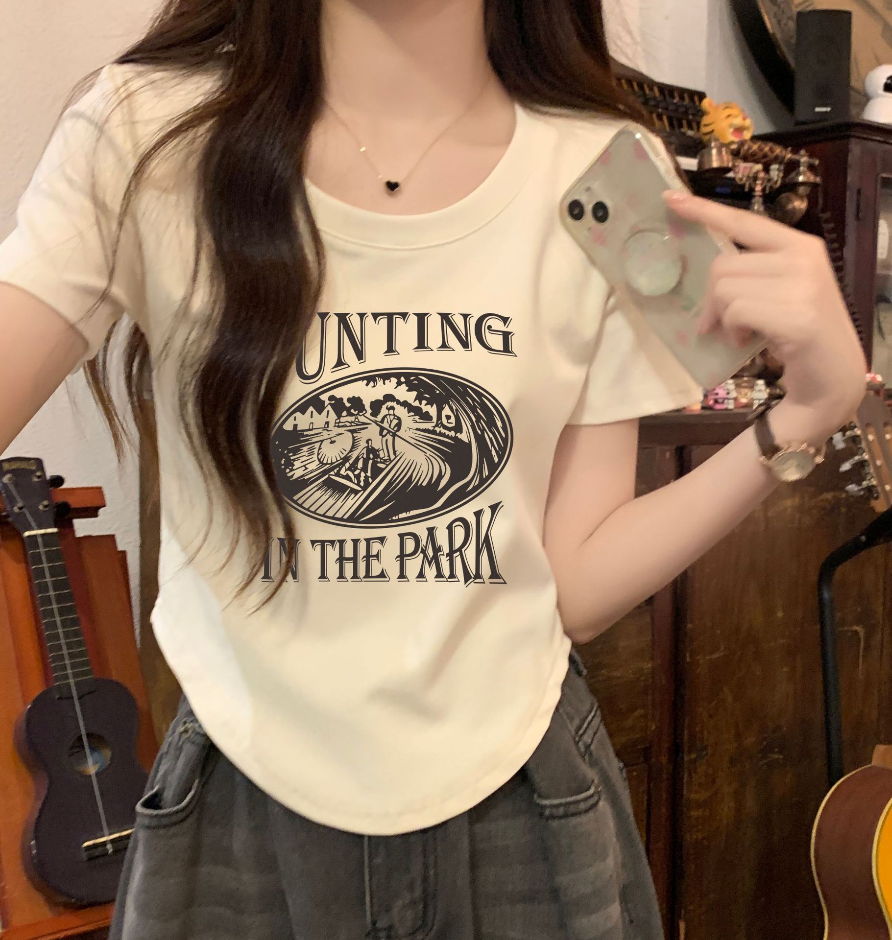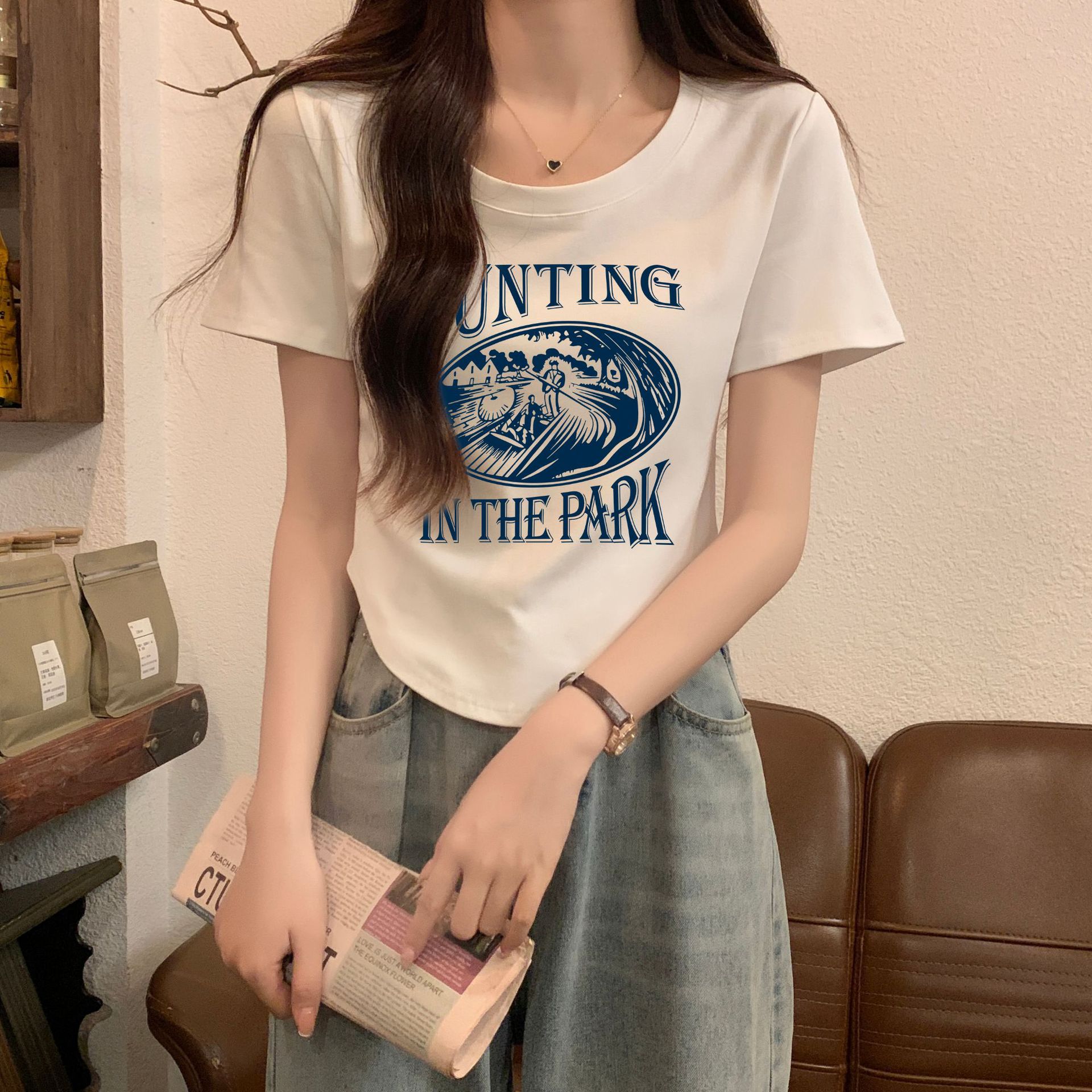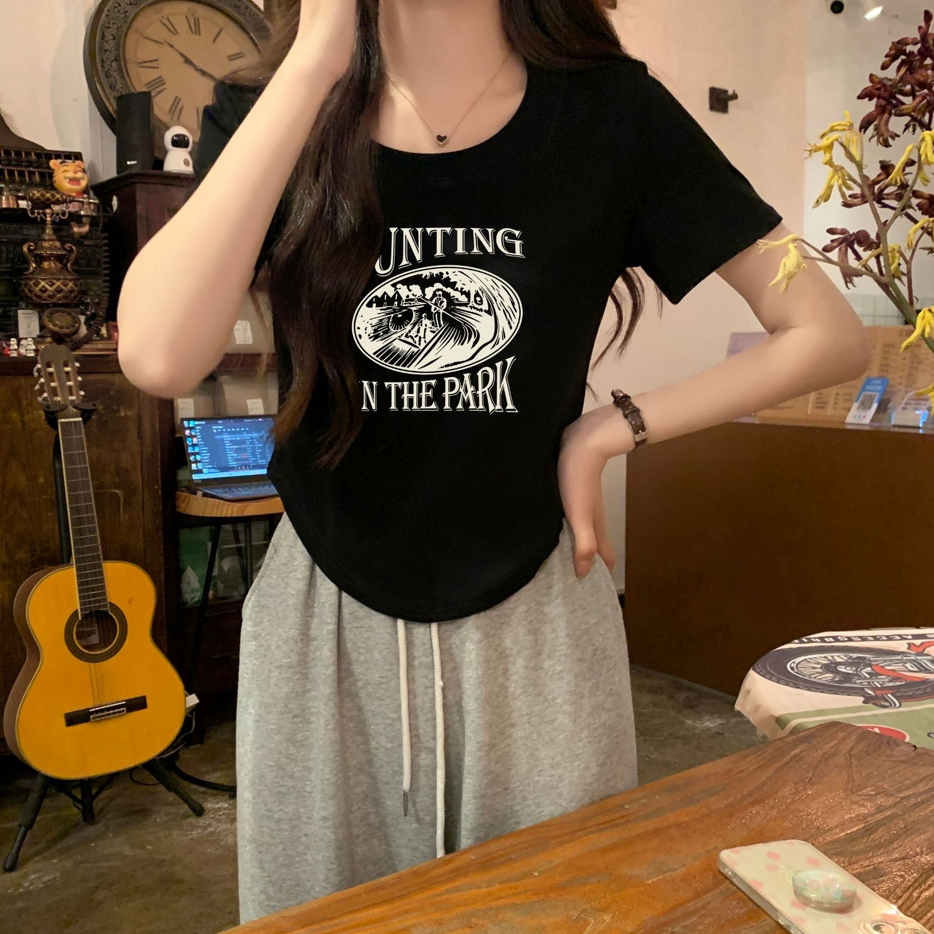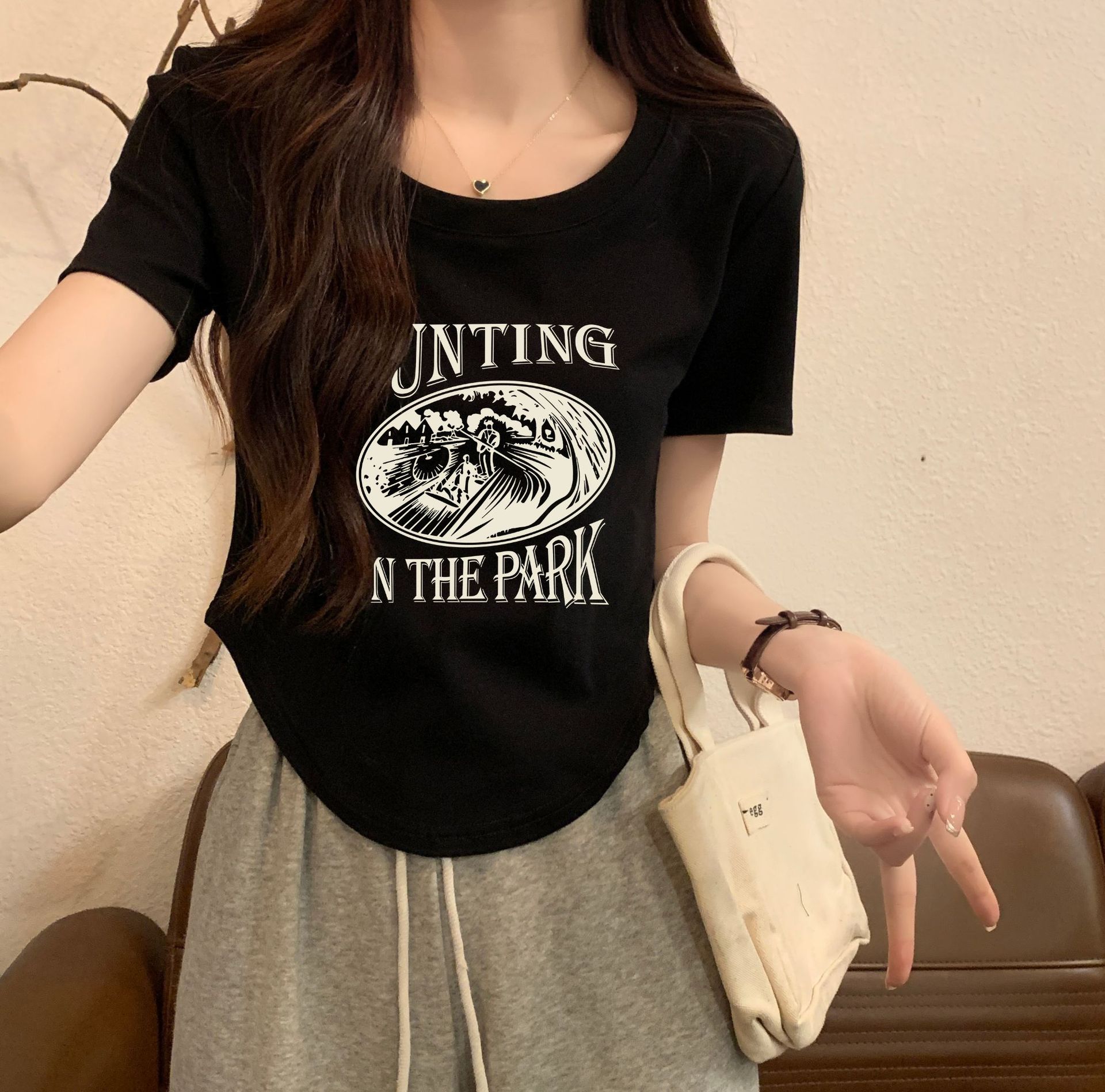 百搭正肩短袖t恤女高级感弧形下摆短款修身高腰辣妹上衣