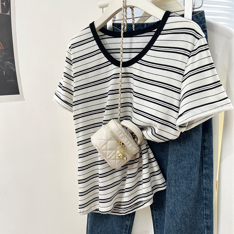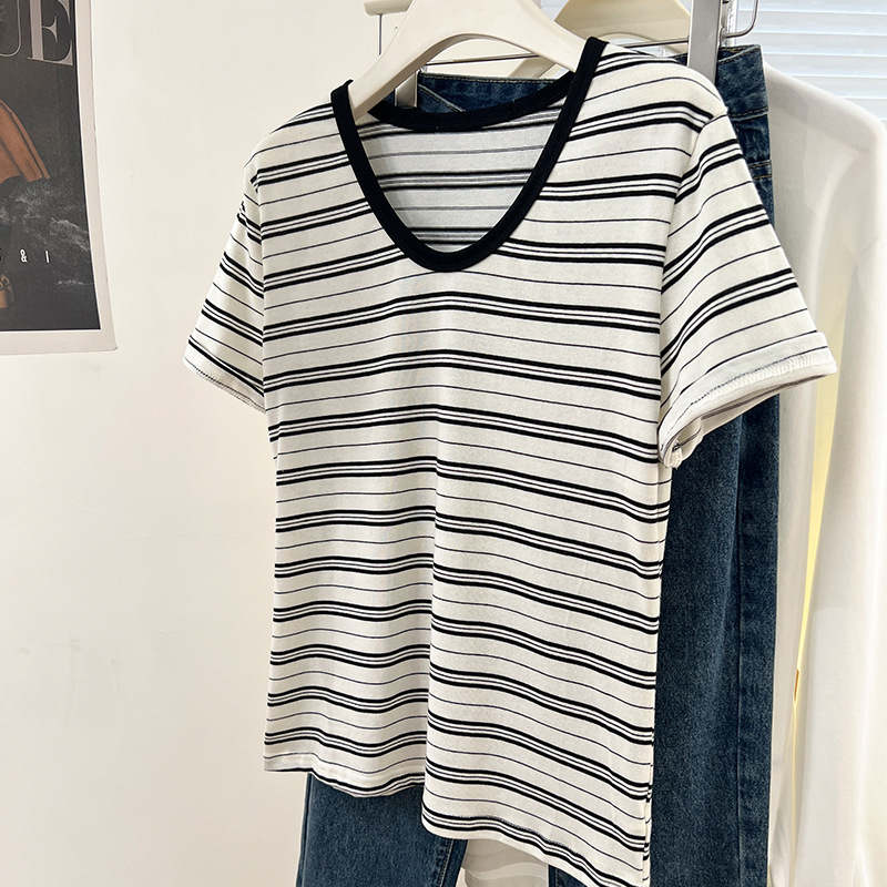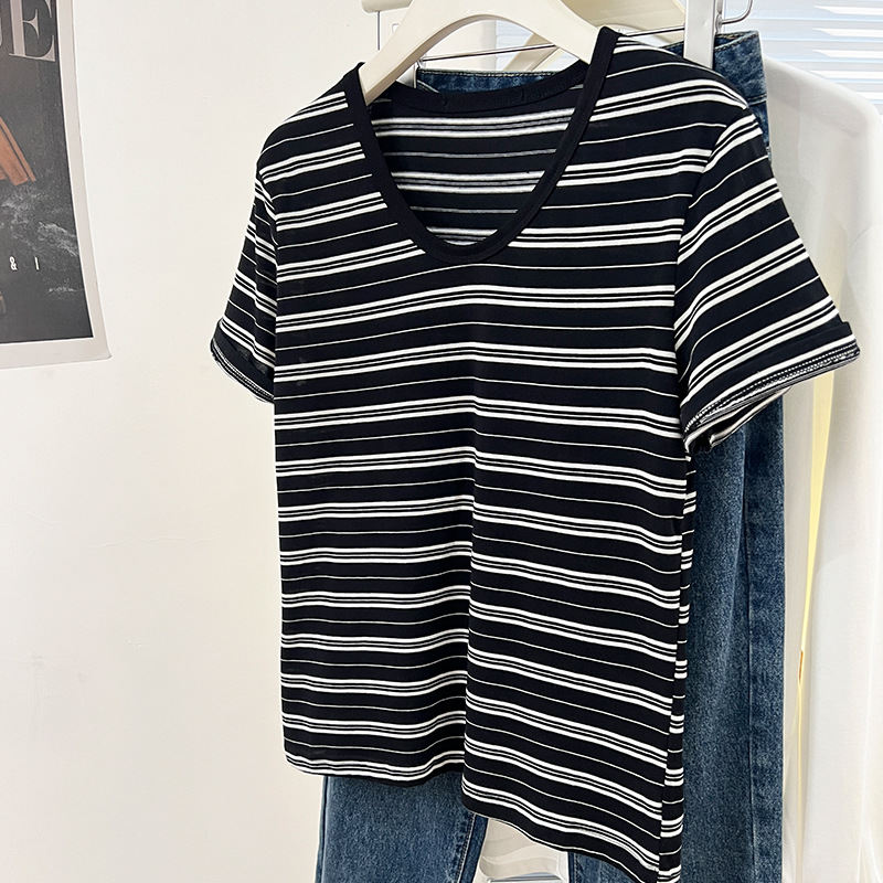条纹U领短袖t恤女春夏新款宽松韩版百搭休闲v领慵懒松弛上衣