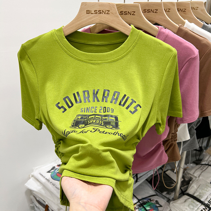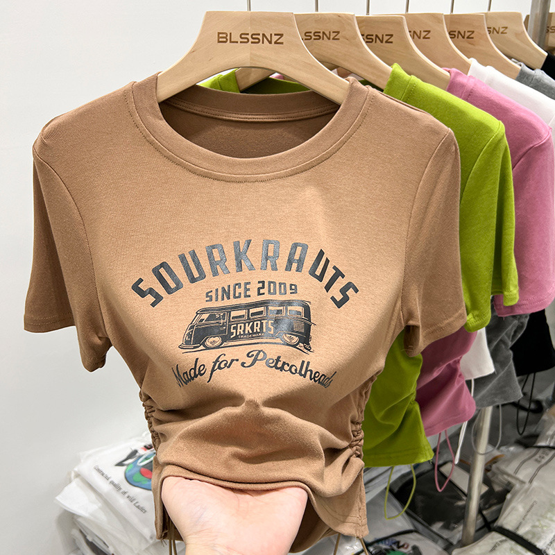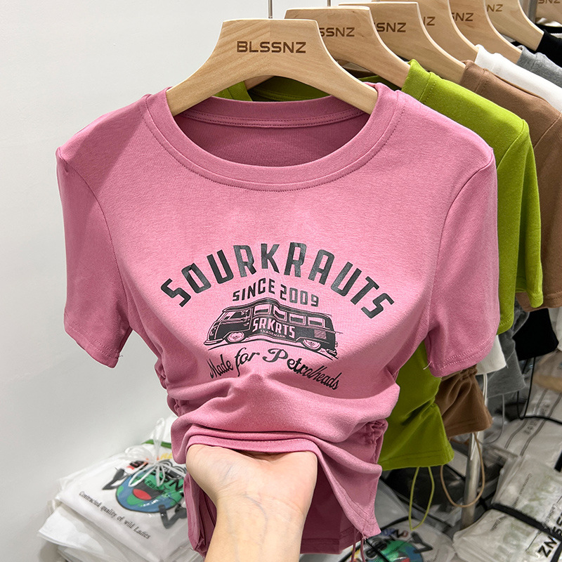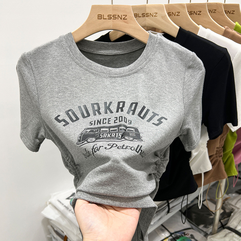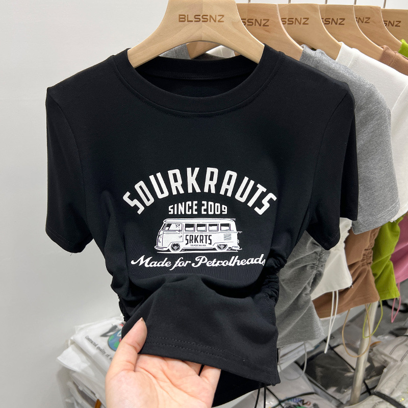 夏季纯棉短袖做旧水洗黑圆领T恤女潮新款学院风复古印花宽松上衣