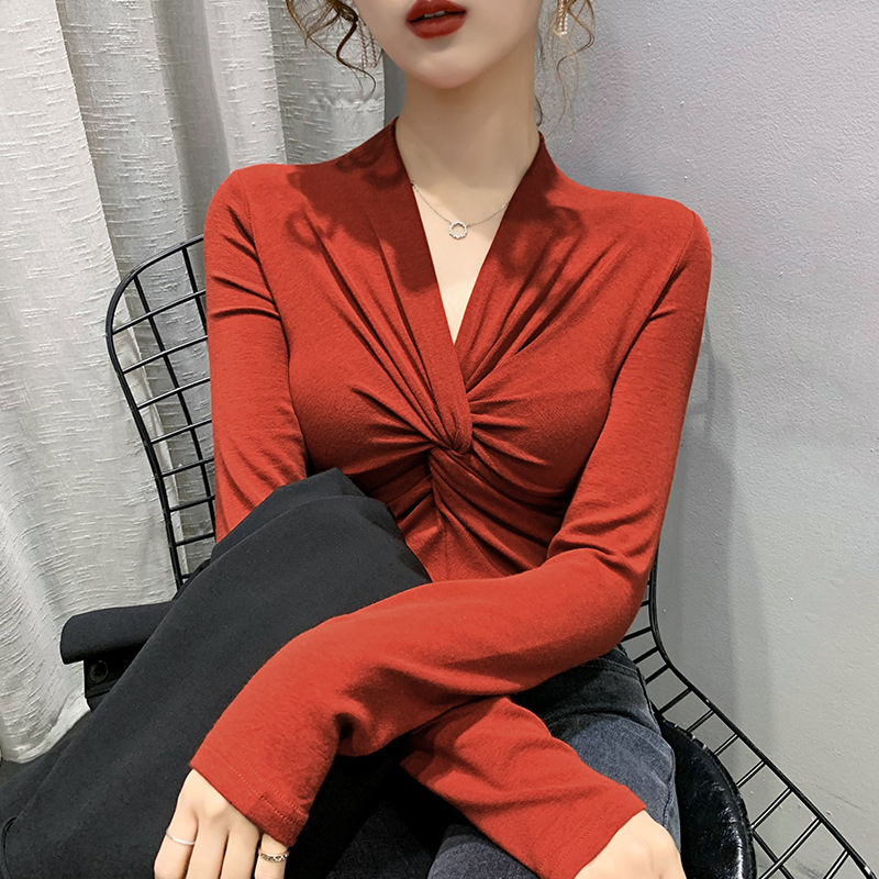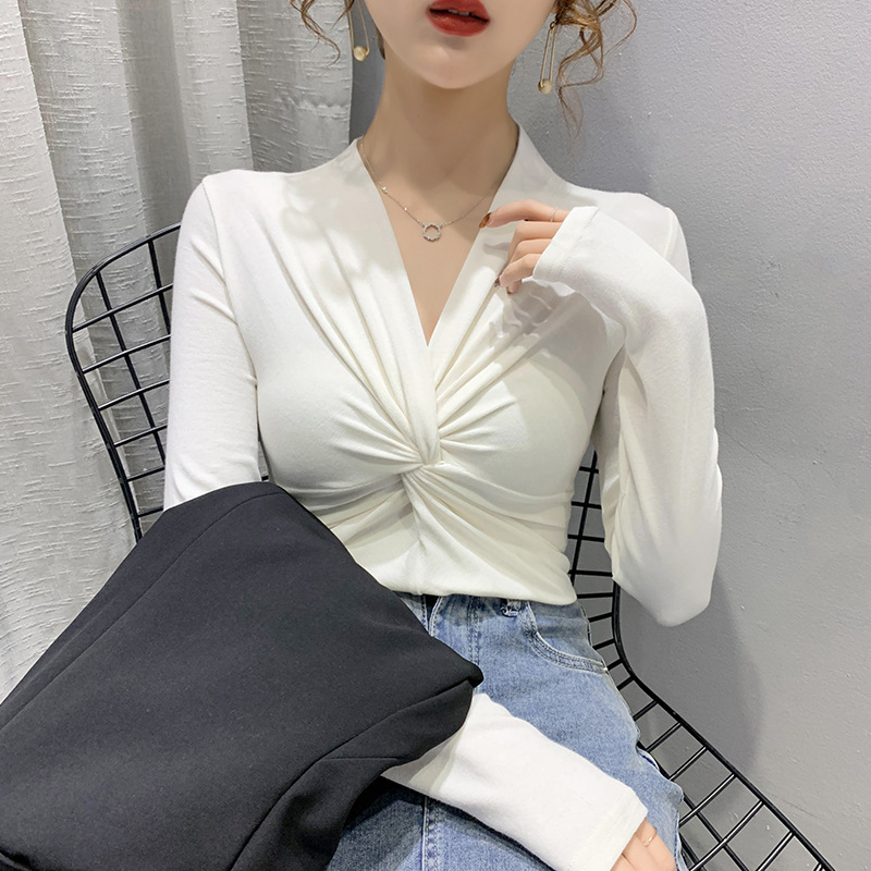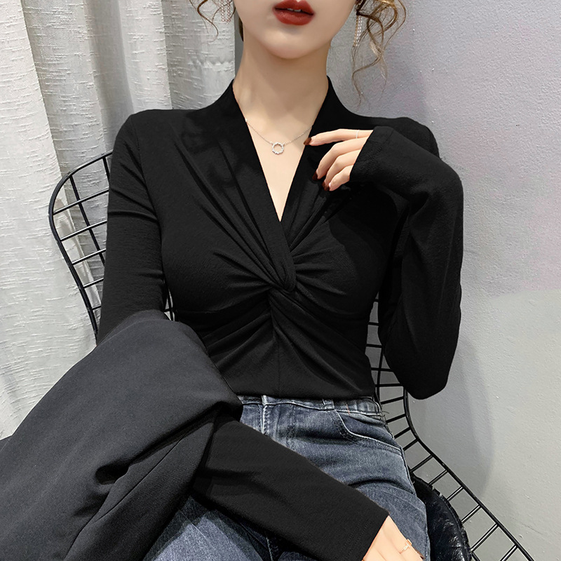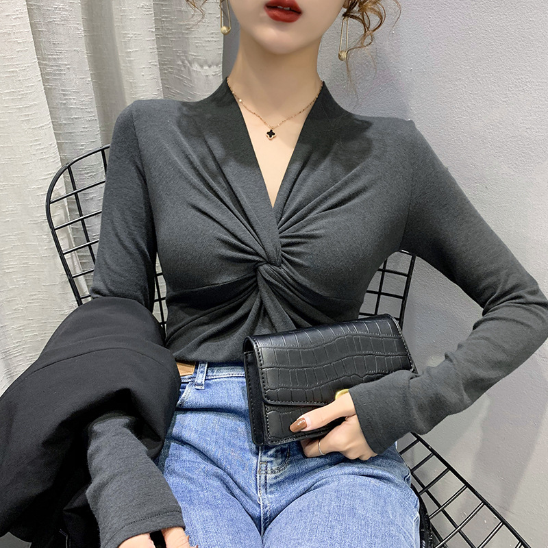 v领长袖t恤女修身初秋新款洋气打底衫别致纽扣设计感上衣