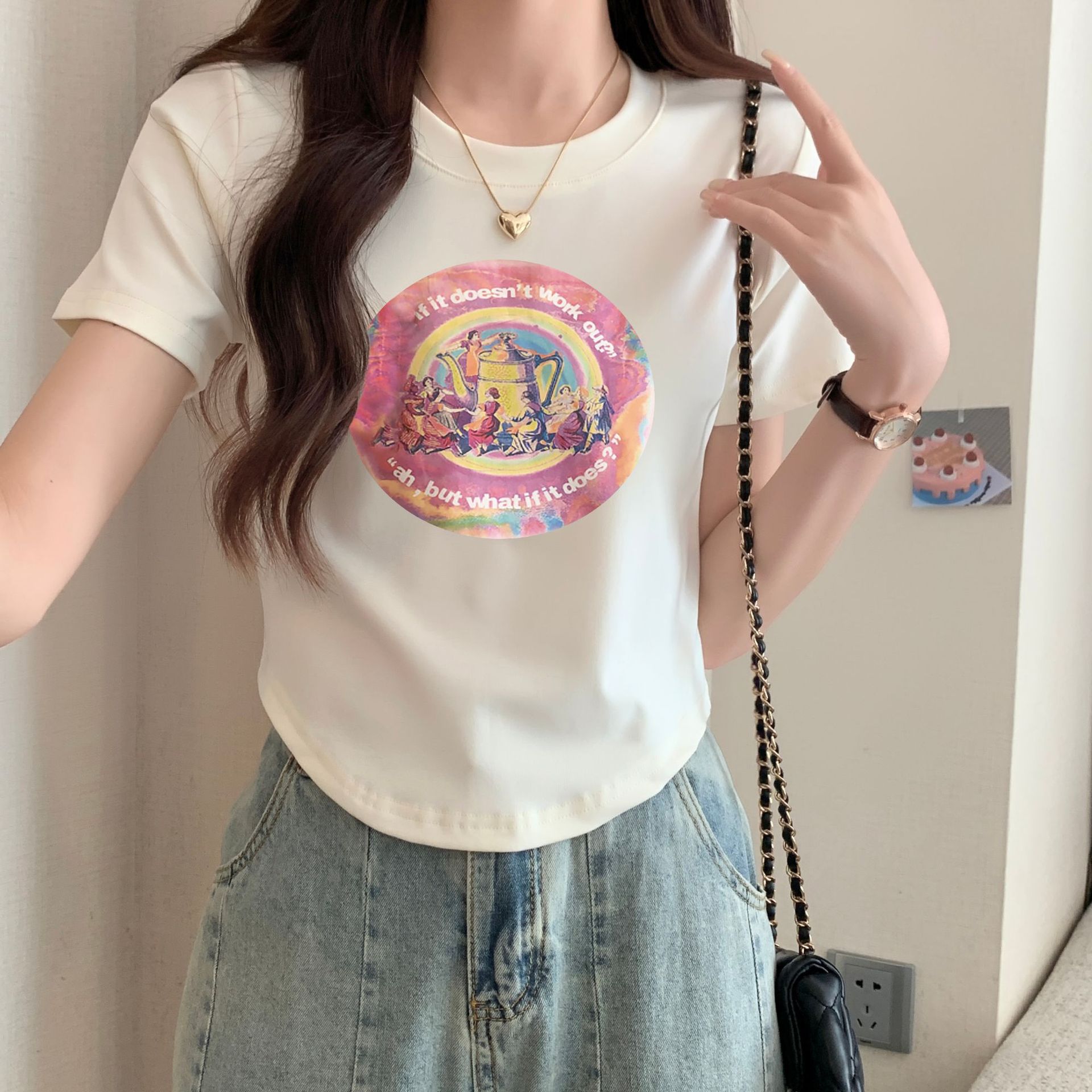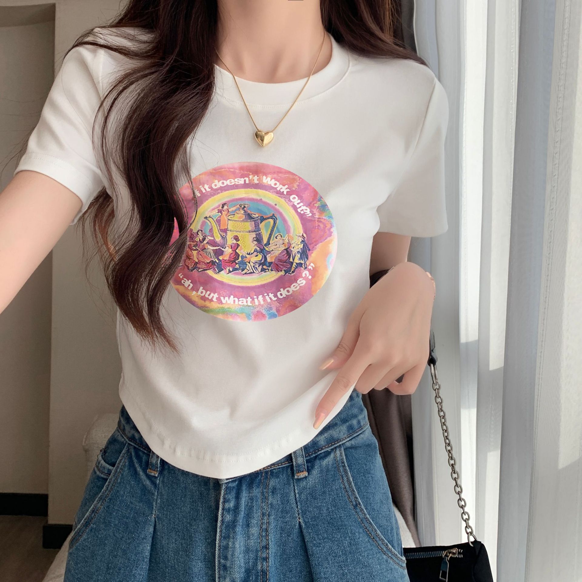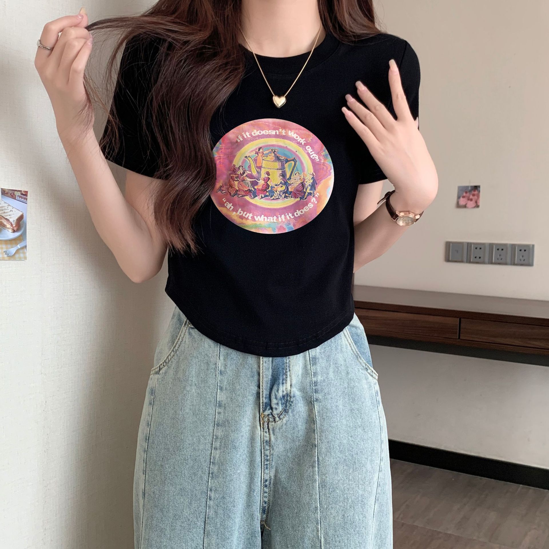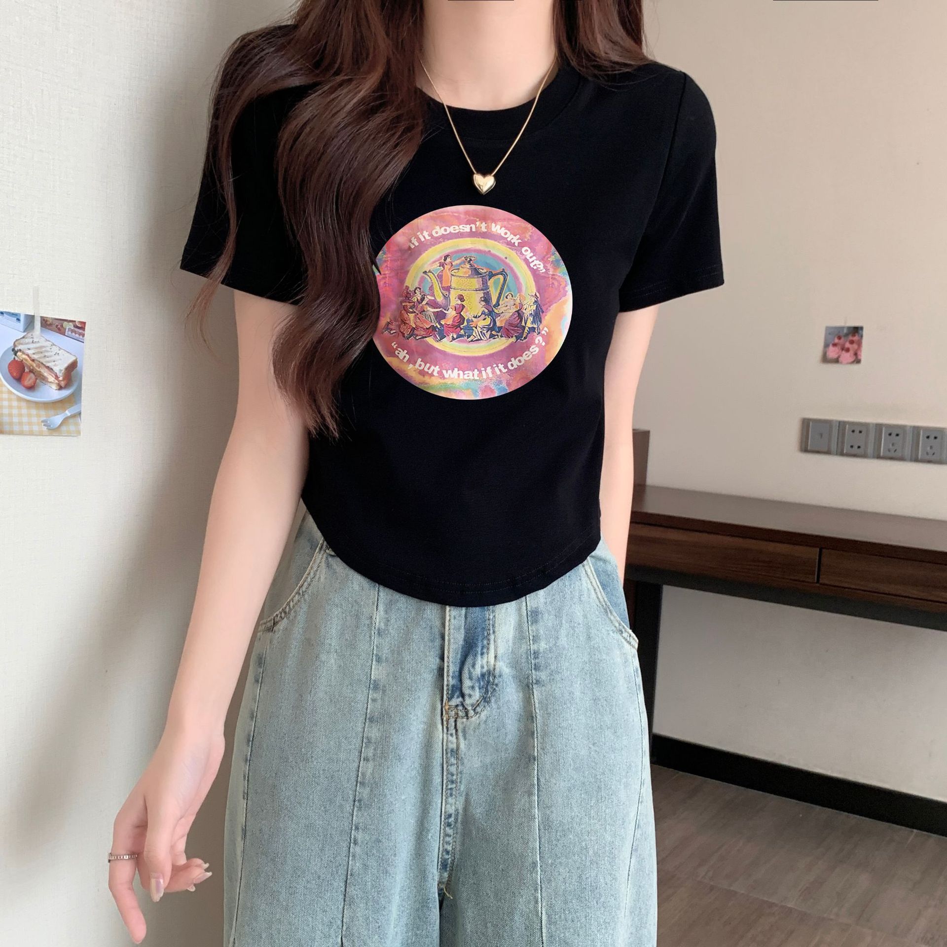 圆领弧形下摆短袖t恤小个子正肩新款修身不规则上衣短款
