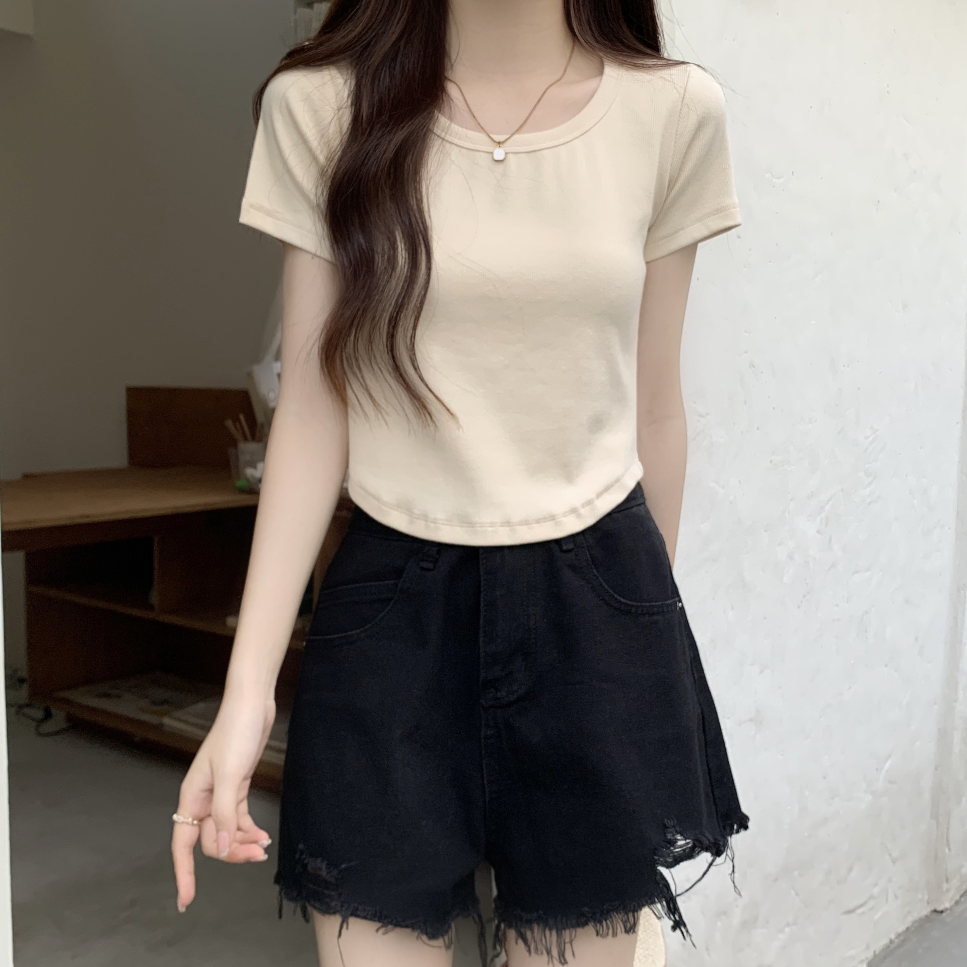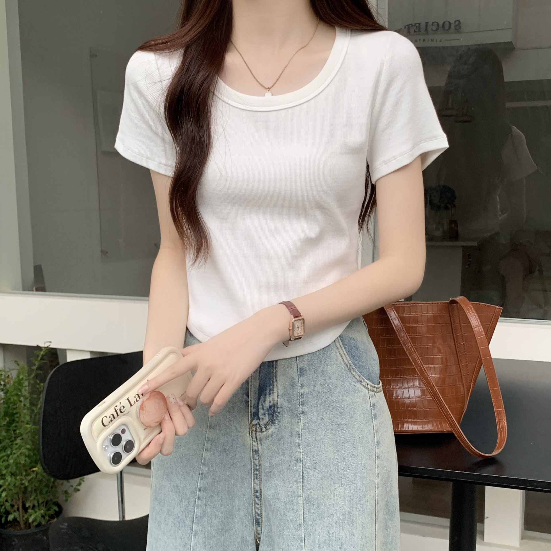 螺纹正肩短袖t恤女夏季设计感小众小个子修身短款上衣