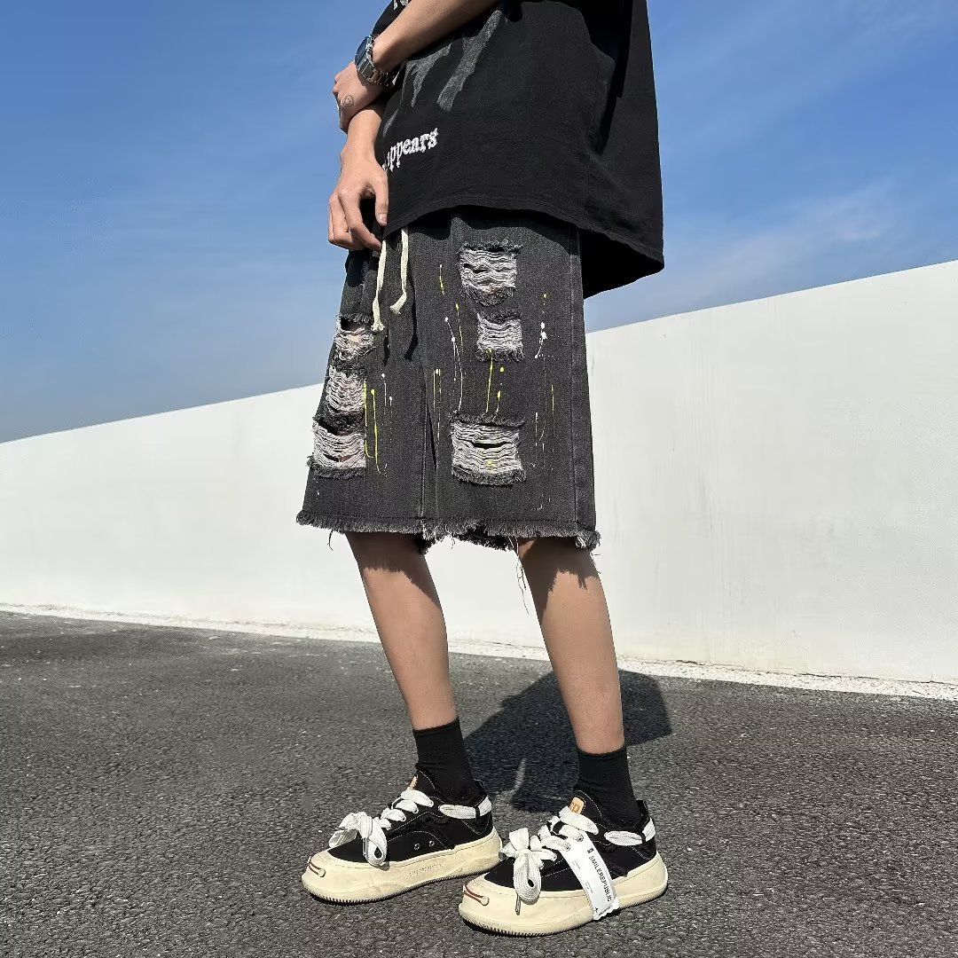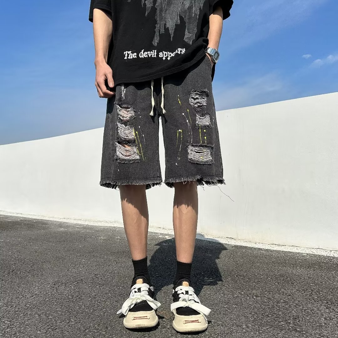 设计感泼墨破洞牛仔短裤男欧美街头潮牌小众痞帅五分乞丐裤男