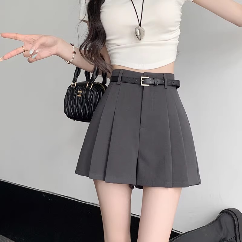灰色西装短裤女夏薄款新款高腰显瘦a字裤裙假两件百褶裤外穿