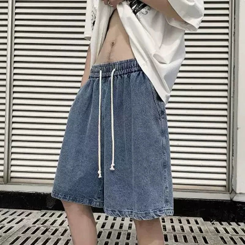 欧美高街hiphop裤子男夏季浅蓝色系绳牛仔短裤水洗做旧过膝五分裤