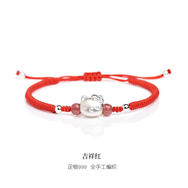 999足银手链男女闺蜜情侣款招桃花红绳纯银KT猫学生礼物手工编织