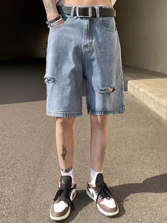破洞牛仔短裤男夏季欧美高街宽松百搭裤子休闲直筒潮牌五分裤三分