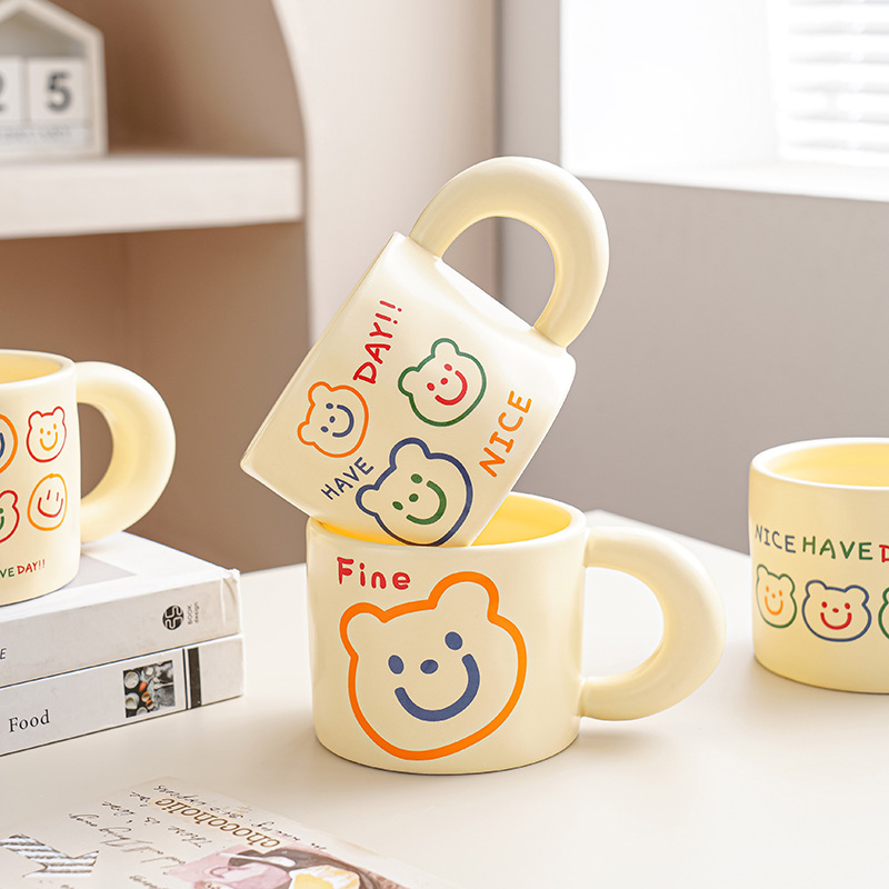 创意奶油风小熊笑脸马克杯高颜值家用陶瓷水杯情侣杯伴手礼礼盒装